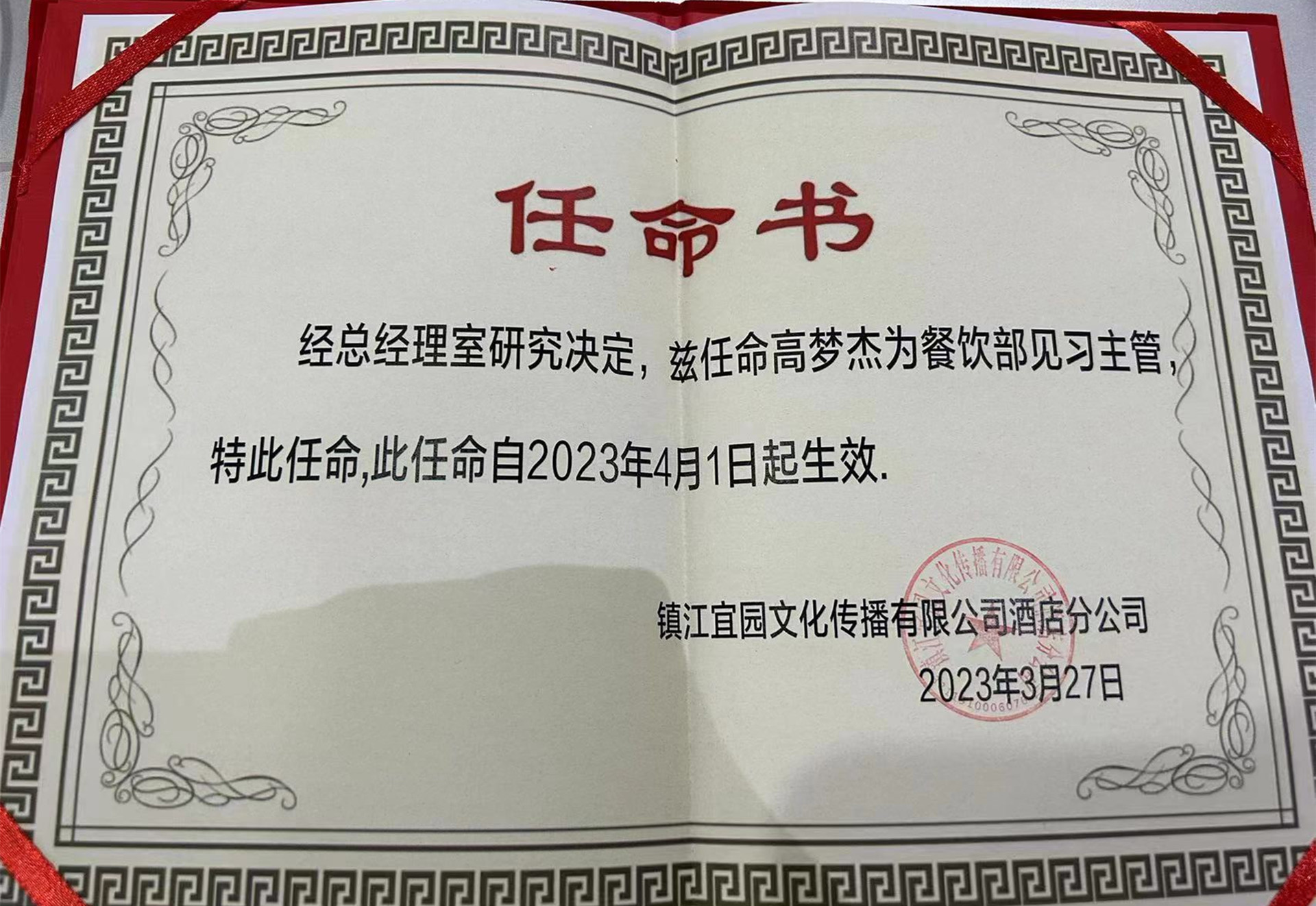 高梦杰是十三水官网 民用航空系空乘专业2020级学生。在校期间,她认真对待每一门课程,用心掌握每一项专业技能知识。2022年进入镇江宜园酒店实习,工作认真勤奋、吃苦耐劳、尽职尽责。实习结束后顺利被镇江宜园酒店录用,在“2022年度优秀员工表彰大会”中获得了“优秀服务奖”并且被任命为餐饮部见习主管。