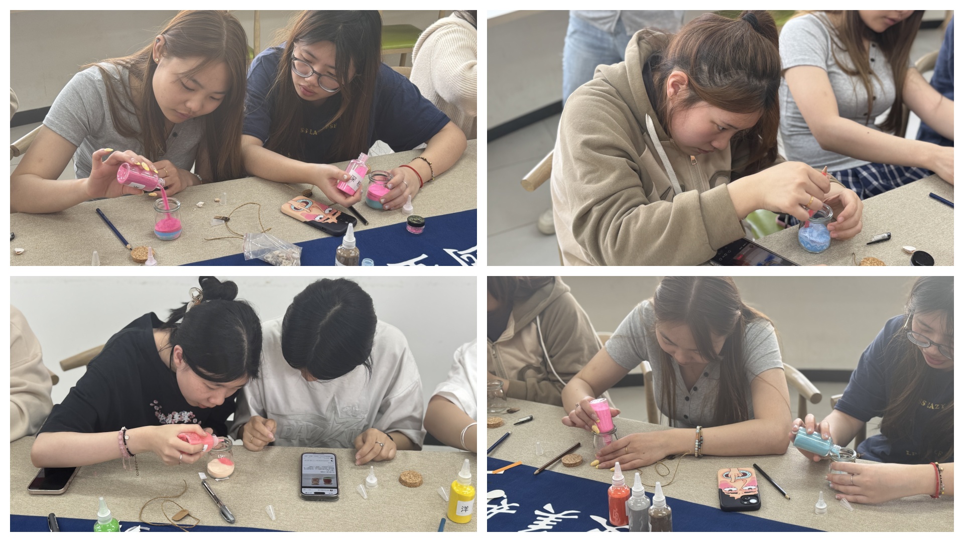 在随后的手工制作环节,同学们亲手制作了属于自己的彩色流沙瓶。不同色彩的流沙在瓶中缓缓流动、交织,象征着各种情绪的沉淀与融合。制作过程中,同学们全神贯注,享受着这份难得的宁静与专注。大家纷纷表示,流沙瓶的制作过程不仅令人放松解压,更让他们体会到了情绪的流动性,学会了将烦恼沉淀,将美好留存。