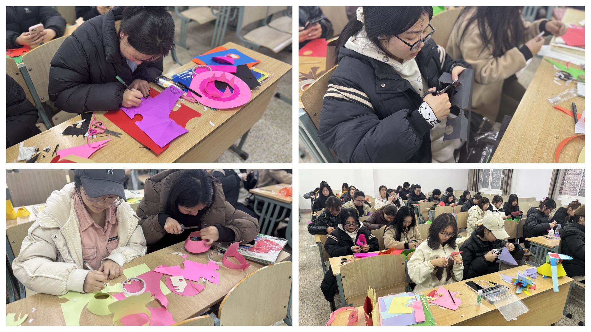 比赛现场,同学们化身“纸艺魔法师”,两三人一组,默契配合。剪刀飞舞,彩纸翻飞,一张张普通的卡纸在他们手中经历了剪裁、折叠、粘贴……最终蜕变成一件件令人惊叹的艺术品。栩栩如生的春天主题家园共育栏,仿佛将春天的气息带入了教室;充满童趣的创意帽子,则展现了同学们天马行空的想象力,也彰显了基础教育系学子们不凡的艺术才华和创新精神。