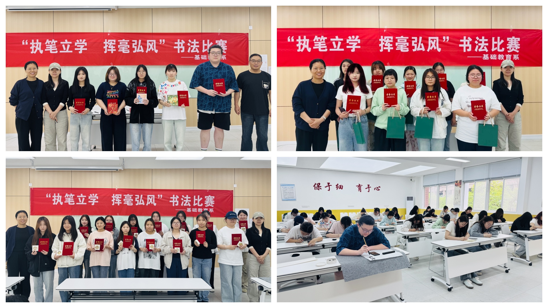 为深入推进学风建设,弘扬中华优秀传统文化,基础教育系于5月15日在9205教室成功举办了“执笔立学,挥毫弘风”书法临摹比赛。此次活动旨在以笔墨为媒、以书法为桥,引导学生在传统文化的滋养中汲取精神力量,涵养良好学风。书法专业教师葛炜担任主评,辅导员沈言静、刘翠云老师共同参与评审,全系学子积极响应、踊跃参赛,在一笔一画间展现青春风貌,赴一场书香墨韵的文化之约。