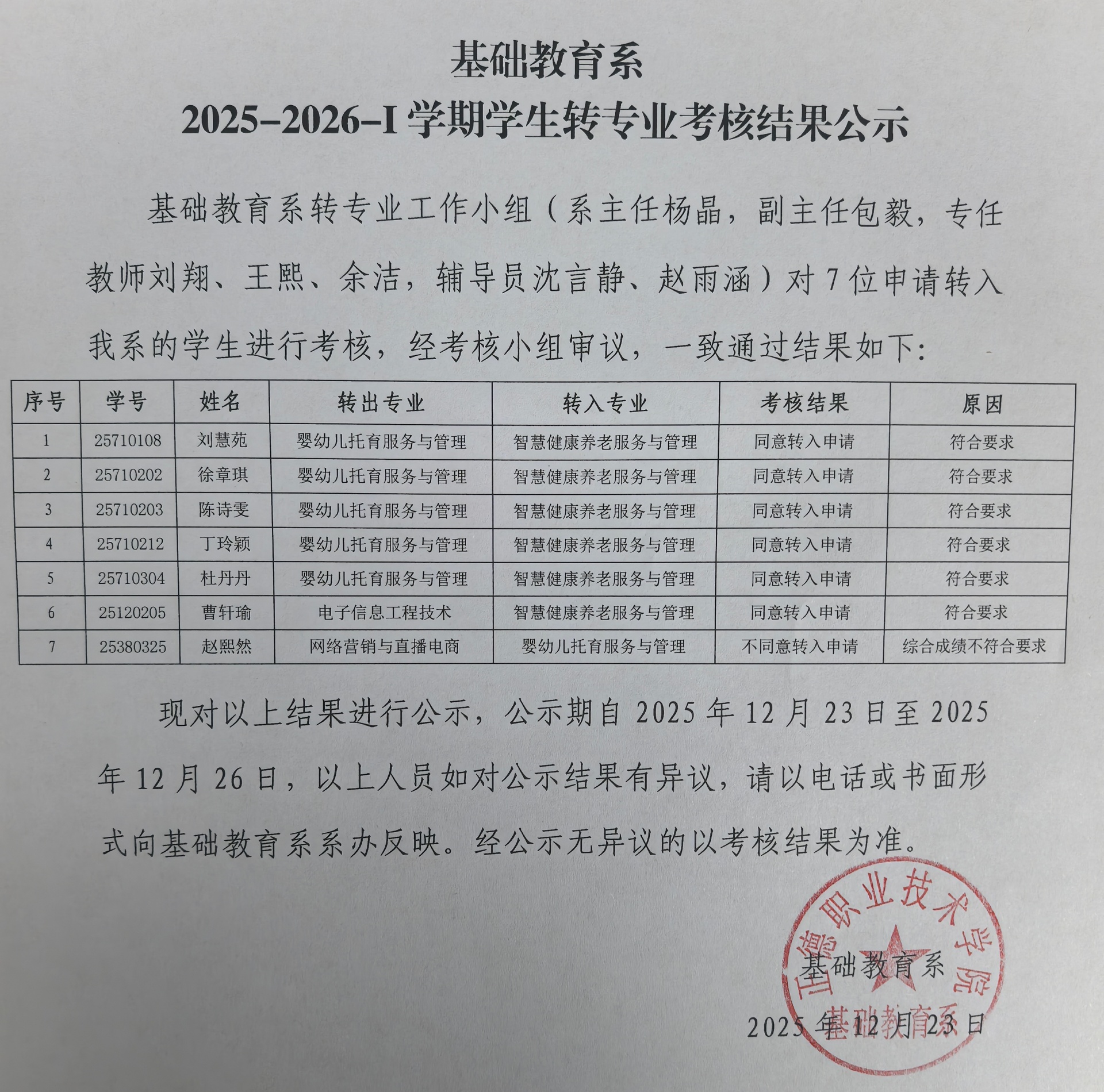 基础教育系 2025-2026-I学期学生转专业考核结果公示