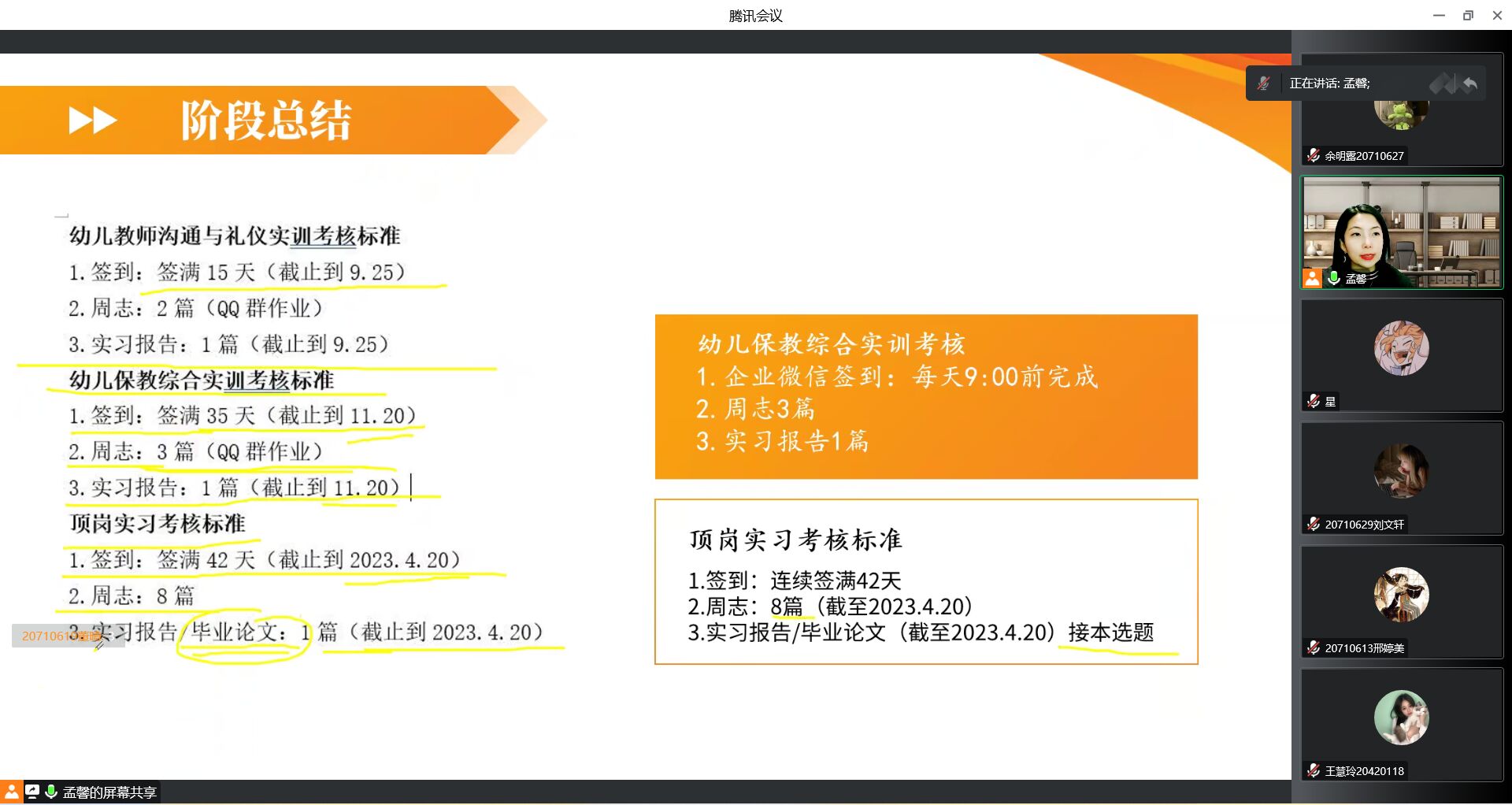 会上,孟馨在了解岗位实习过程和实习效果的基础上,对《幼儿教师沟通与礼仪实训》《幼儿保教综合实训》等课程进行了总结。孟馨表彰了在岗位实习中表现优秀的同学,仔细询问了学生在岗位实习中的收获与困难,引导学生正确认识岗位实习意义,并对学生实习以来遇到的问题进行指导答疑,及时进行帮扶。在校企合作单位“U尼可童学园”实习的王梓骁表示,“感谢孟老师每周召开岗位实习线上会议,帮助我们明确阶段目标,及时指出实习中存在的问题。让我们在岗位实习中感受到十三水游戏 的关心,很温暖,有力量。”