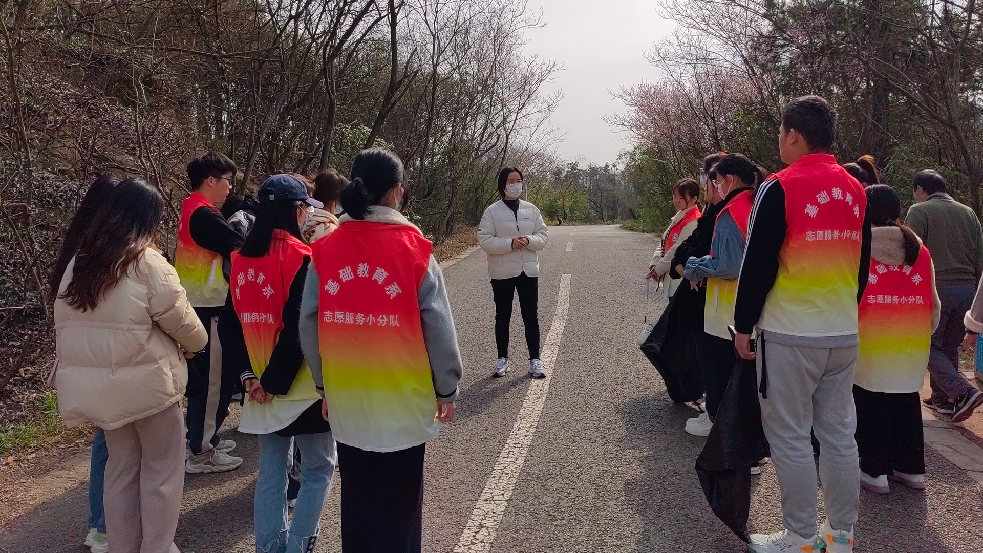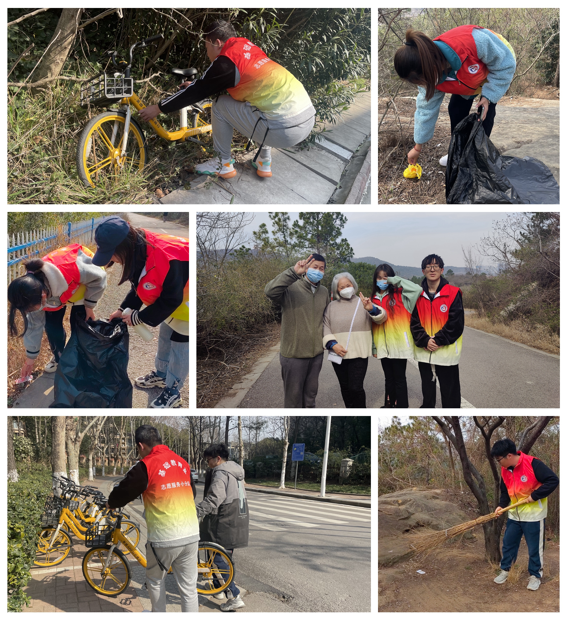 南京的三月,似乎还残留着寒冬的料峭,又带着些许早春的温暖。同学们手拎垃圾袋来到翠屏山,一路捡起路边的垃圾。看到草丛旁随意倒放的共享单车,会积极将单车扶起摆放到路边指定位置,共同维护翠屏山的文明环境。在登山的过程中看到带小孩的家长,同学们会主动帮家长搬起小朋友的自行车;看到扫地的环卫工叔叔会抢着拿过他的扫帚帮忙扫起地上的瓜子壳和废纸;看到散步的爷爷奶奶,会主动和他们打招呼聊天,介绍着自己并陪着爷爷奶奶一起登山,这一路同学们都在用爱心、热心去感染遇到的所有人,争做为人民服务、助人为乐的雷锋精神的传承者。