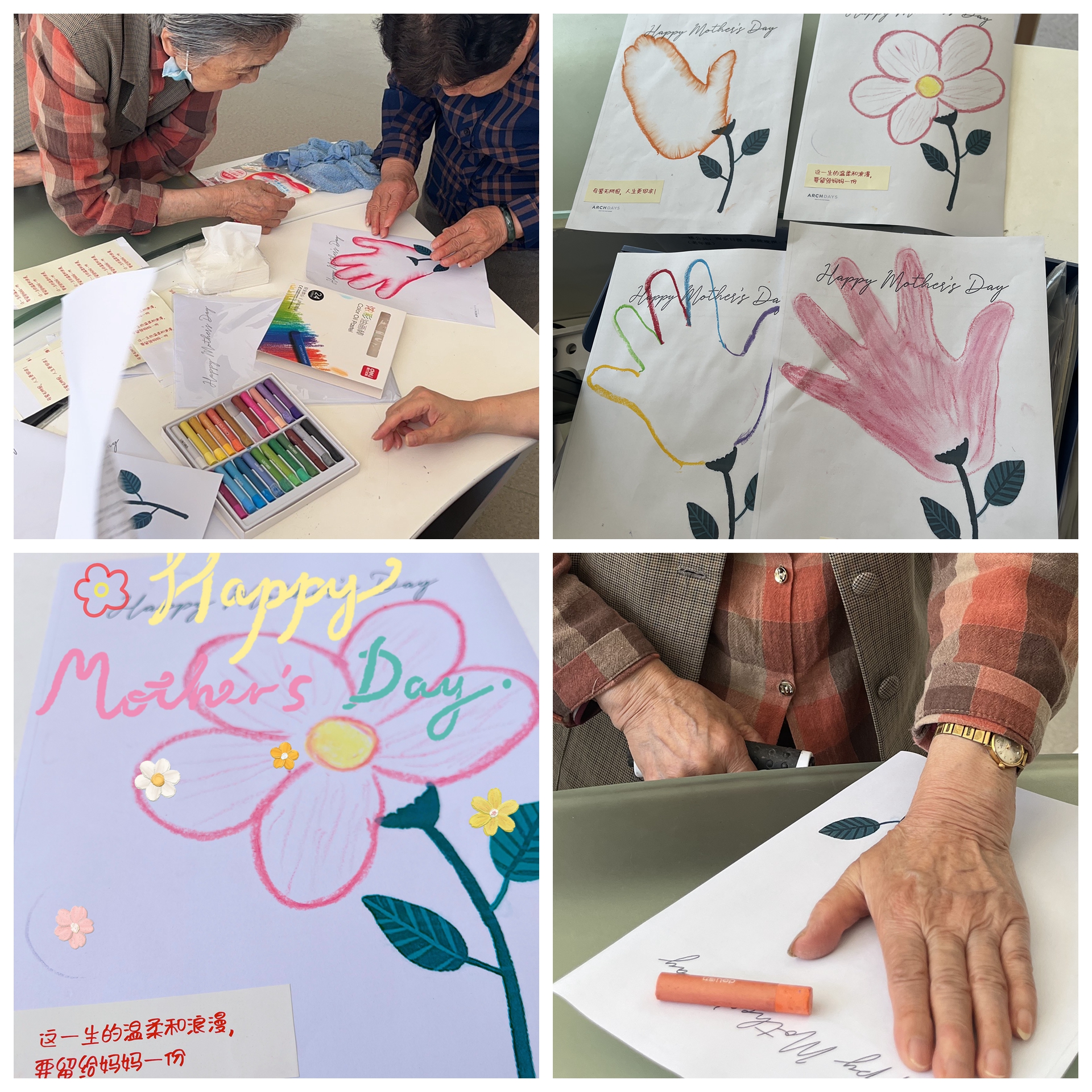 歌舞表演结束后,志愿者们带着老人们一起做手印彩虹画手工。老人们在同学们的指导下,开始一步步手绘创作。她们精致的涂抹,勾画出自己喜欢的图案,也见证了长者们对生活的热爱与向往,让大家沉浸在这无忧的慢生活中。