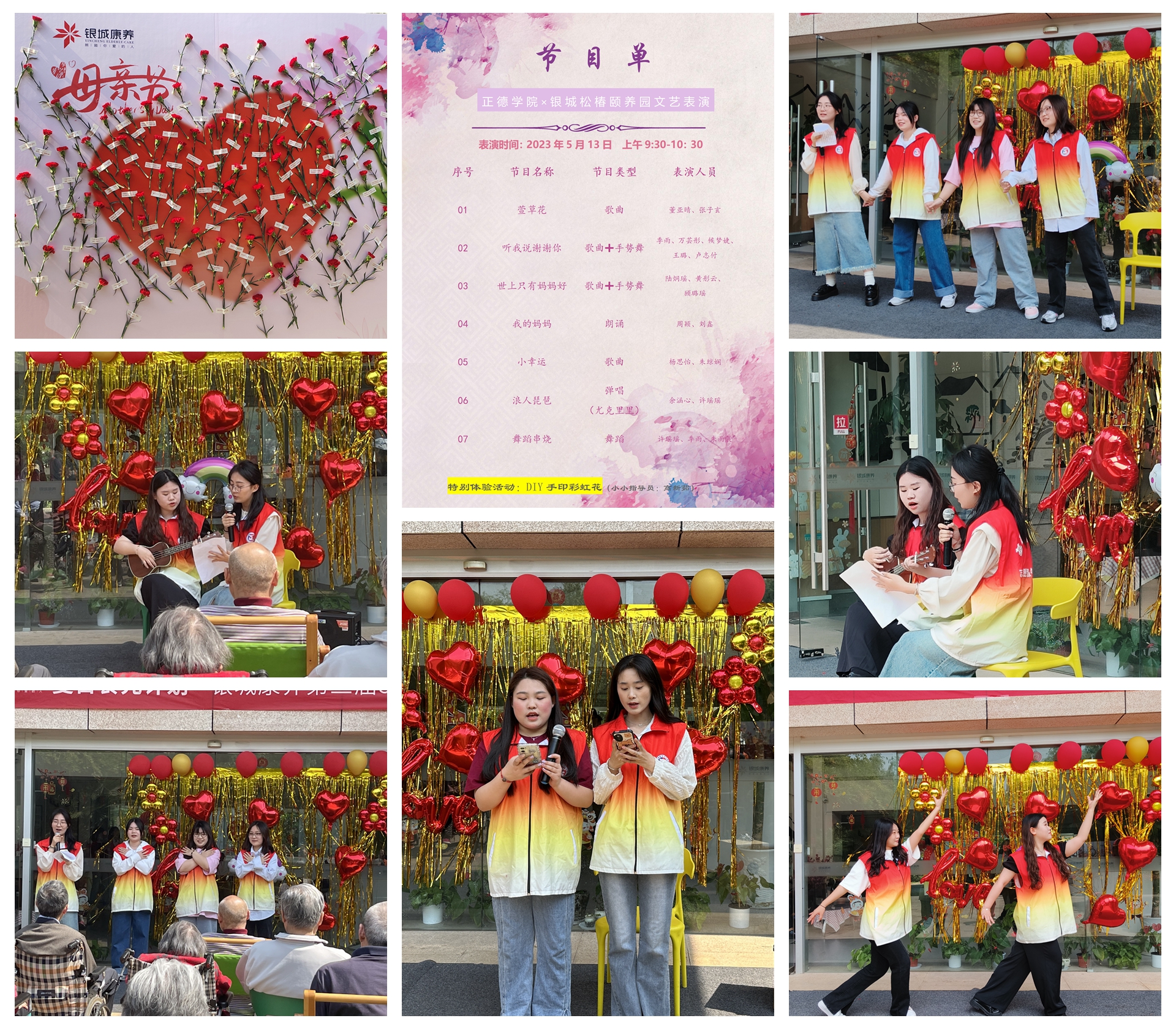为了这次的活动,志愿者们精心准备了一台精彩的文艺表演,其中有歌曲串烧《萱草花》、《听我说谢谢你》、《世上只有妈妈好》和《小幸运》,周颖和刘鑫的朗诵《我的妈妈》,余涵心和许瑶瑶同学精的尤克里里弹唱《浪人琵琶》,许瑶瑶、朱雨晨和季雨的带动现场的舞蹈串烧。老人们积极互动、笑声连连,掌声不断,活动现场温情又感人。