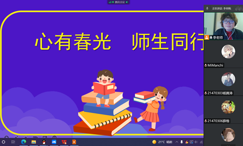 此次班会围绕“心有春光 师生同行”,从“当好个人自我健康的守护者、当好个人学习成长的自律者、当好个人心灵快乐的调节者”三个方面,借助腾讯会议平台,组织学生开展疫情期间的学习、生活的交流。