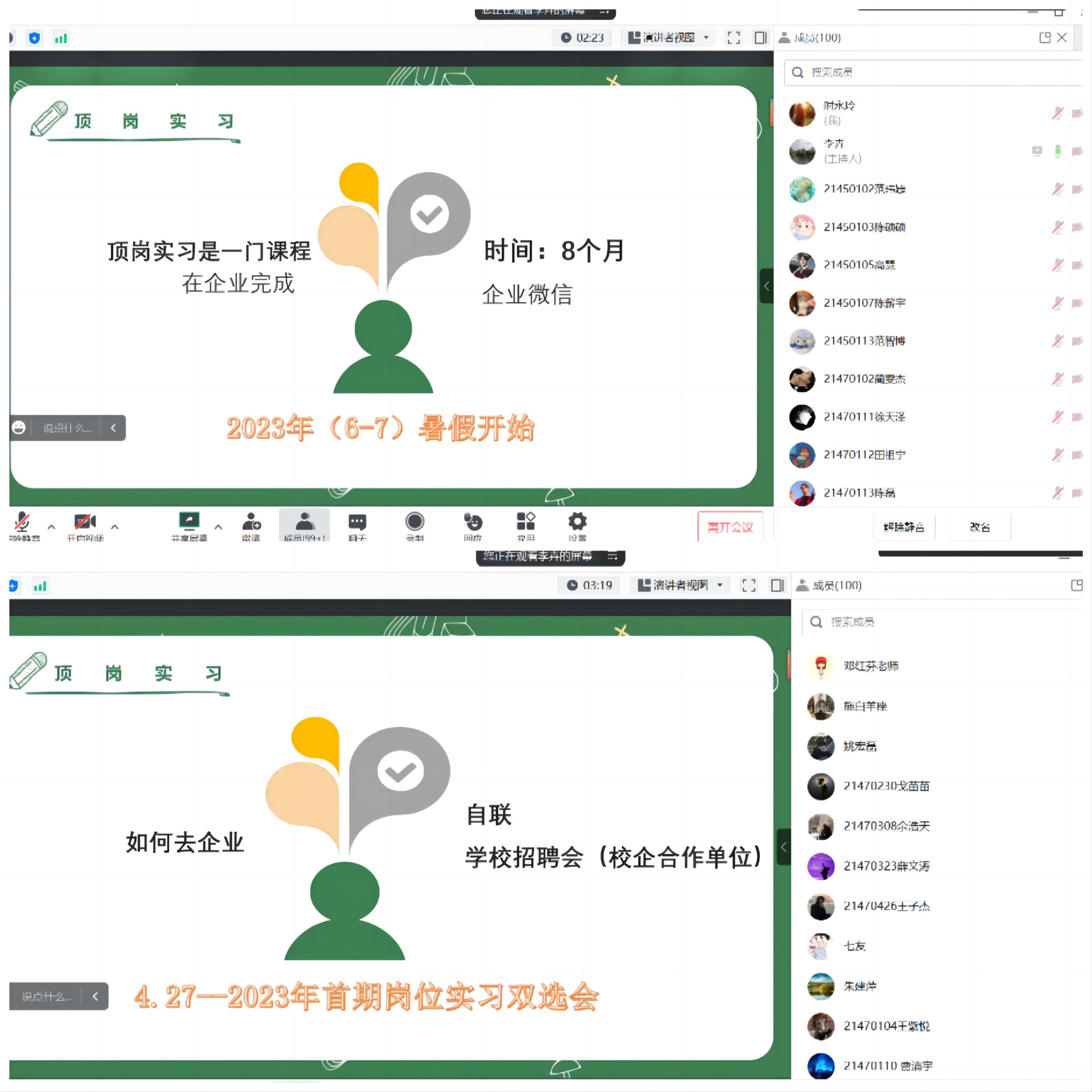 为了进一步完善我系毕业生顶岗实习和就业工作,引导学生做好顶岗实习的心理准备,2023年4月8日晚19:30在腾讯会议举行了题为“顶岗实习 “职”引未来”的线上班会活动,班主任李卉、花卉、时永玲、邓红芬及辅导员朱建萍和21级全体工程造价专业同学参加了本次活动。