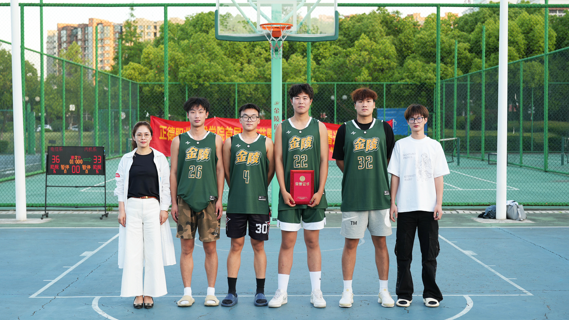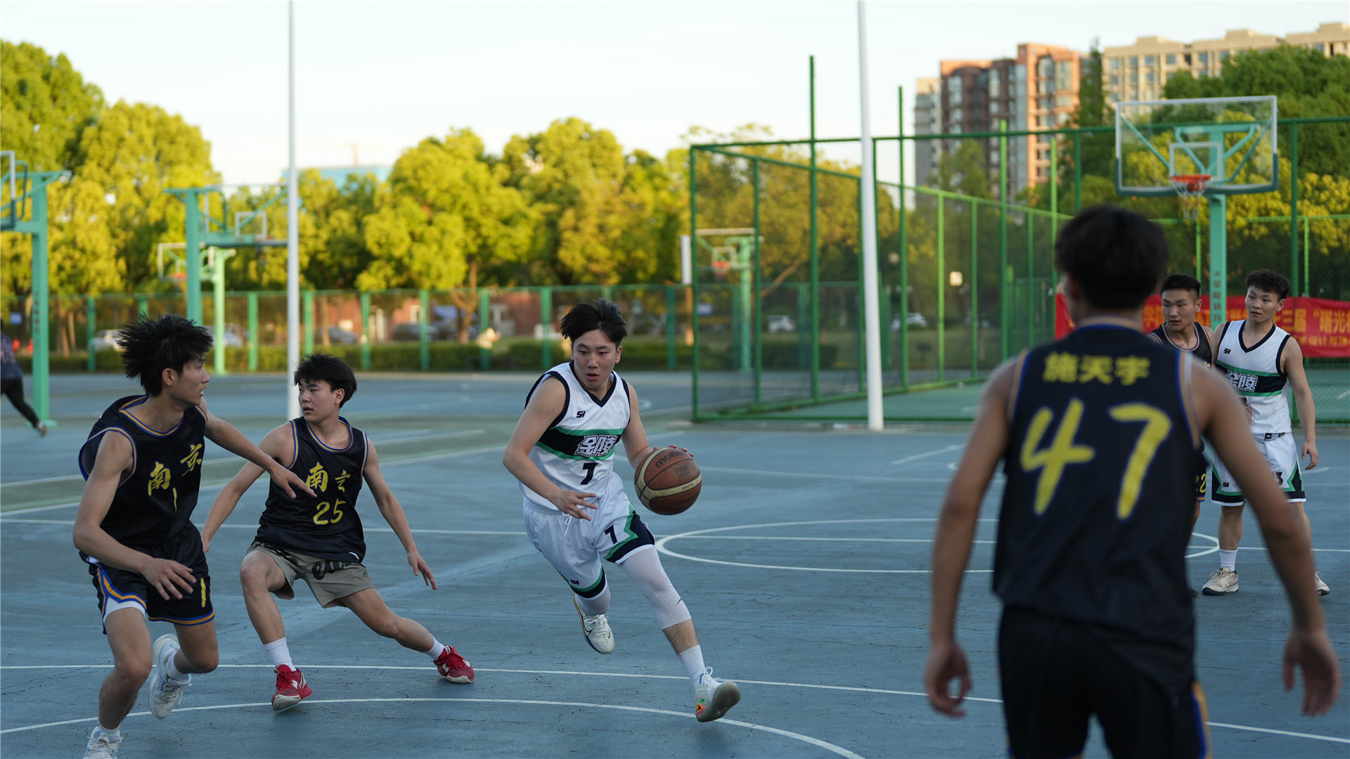 赛场上,球员们积极投入、全力以赴;挥洒汗水、点燃青春;火力全开、一往无前。干净敏捷的运球转身、精准无误的三分投篮,不知疲倦的奔跑、跳跃、防守、进攻,一个个回合将比分迫近、反超、取胜。赛场上的声声呐喊与喝彩,热烈而澎湃。以热血励青春,他们向前奔跑,永不言弃!