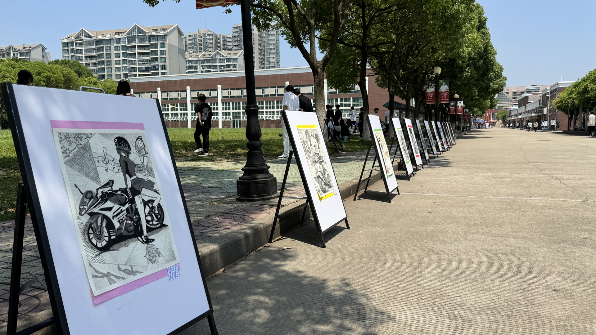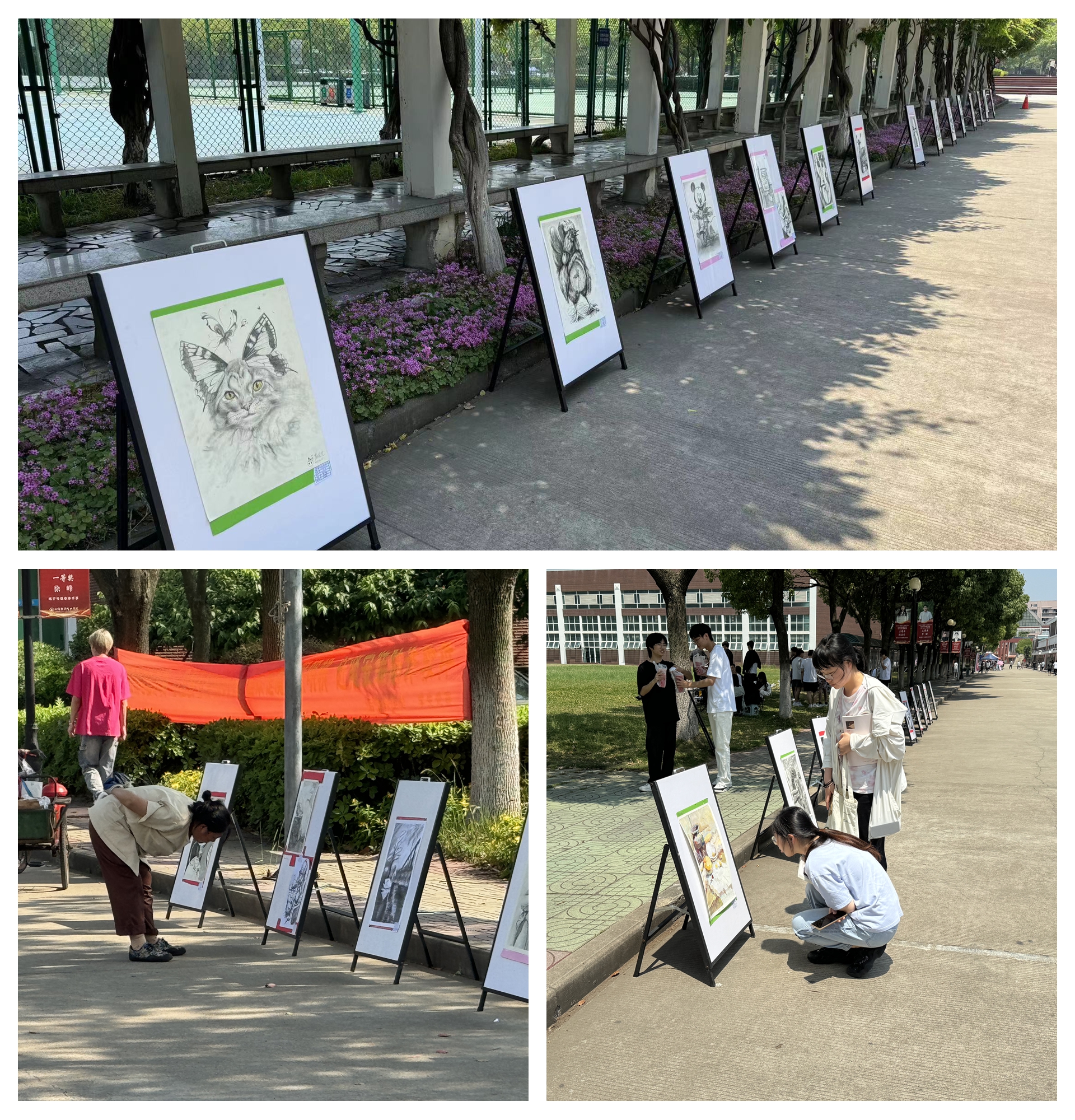 本次课程作业展示是两位任课老师在设计素描、设计色彩这两门课程上课期间各自评选出的优秀作业,总共60余幅。看着紫藤长廊展出作品,同学们纷纷表示通过一段时间的绘画训练,洞察力、分析能力、表现力、思维能力都有所提高,也充分体会到了一分耕耘一分收获。