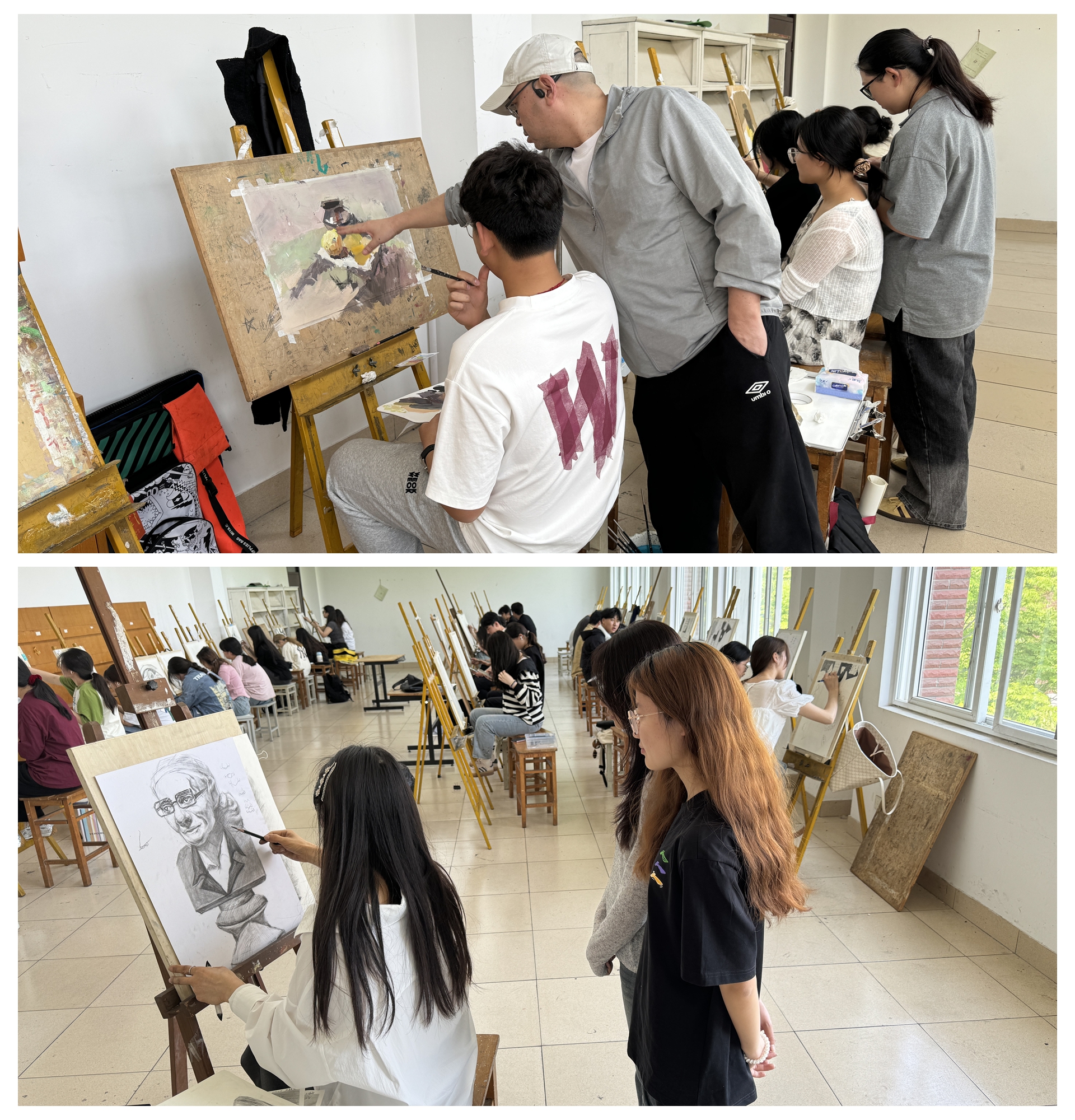 2023级建筑室内艺术设计专业的同学们作为刚进校的学生,学生的专业基础水平参差不齐。在这种情况下,袁荣花和郭力老师采用不同专业程度的不同的教学方法,课堂讲授绘画理论,课堂示范绘画方法。对专业基础好的同学,强调画面细节的处理,增进深入的能力,画面整体的把控,提高画面艺术感。无基础的同学从零开始,从拿笔,排线,理性观察,透视、比例、造型,最基本的单体几何体开始绘画,到几何体组合画面,再到静物单体,最后能够画出一组静物造型。