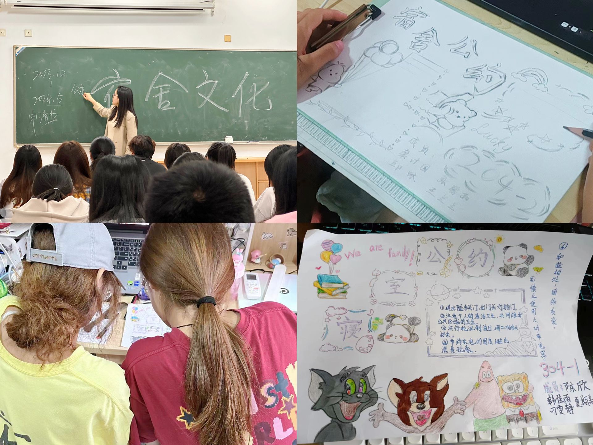 辅导员王思思在晚自习活动中鼓励学生在文明宿舍评比月中,积极发挥专业特长,以宿舍为单位团结合作,一起完成一幅“宿舍公约”作品。同学们利用晚自习的时间,围坐在一起,热烈讨论公约的内容。有的同学负责撰写公约的草案,有的同学则负责搜集相关的素材和图片,还有的同学则负责绘制公约的插图和装饰。每一份“宿舍公约”作品不仅展示了学生们的创意,更传递了文明、和谐、向上的宿舍文化。