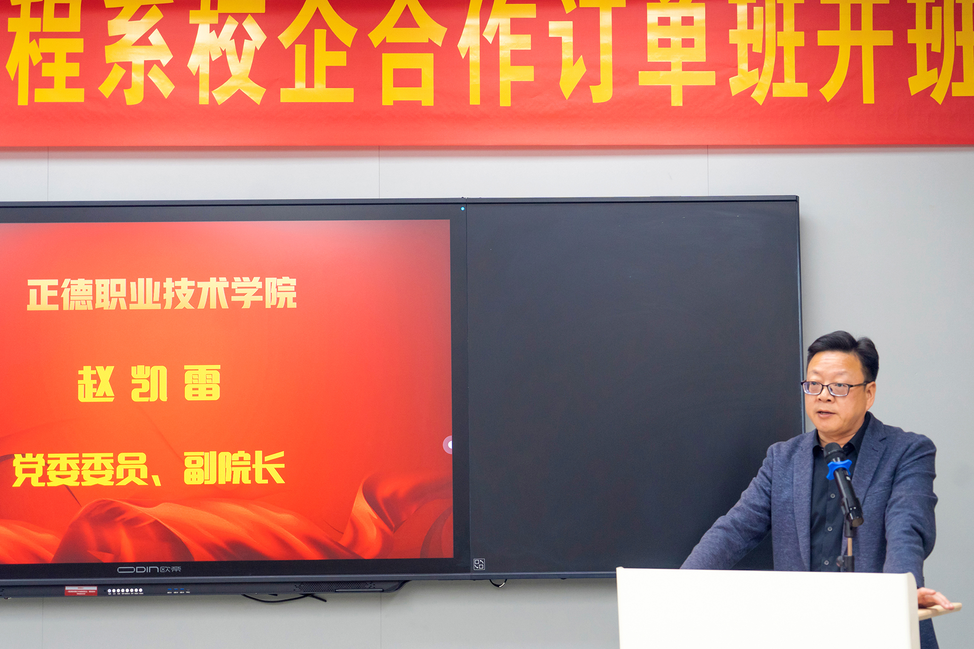 最后,十三水游戏 副院长赵凯雷讲话。他首先对南京铭望装饰设计有限公司和江苏智檬智能科技有限公司在校企合作中所展现出的积极态度和大力支持表示了由衷的感谢。他强调,校企合作是实现教育链、人才链与产业链、创新链有机衔接的重要途径,对于培养符合市场需求的高素质技术技能型人才具有重要意义。通过校企合作,十三水游戏 能够更好地了解企业的需求和行业的发展趋势,从而不断调整和优化人才培养方案,为学生提供更加广阔的实践舞台和成长机会。同时,企业也能够通过校企合作获得更多的人才支持和智力支持,推动企业的创新发展和转型升级。赵副院长还对成功入选“铭望订单班”与“智檬订单班”的学员表示了热烈的祝贺,并鼓励他们要珍惜这次难得的学习机会,不断发扬“正德”精神,勇于担当、敢于创新,为十三水游戏 的荣誉和社会的繁荣贡献自己的力量。