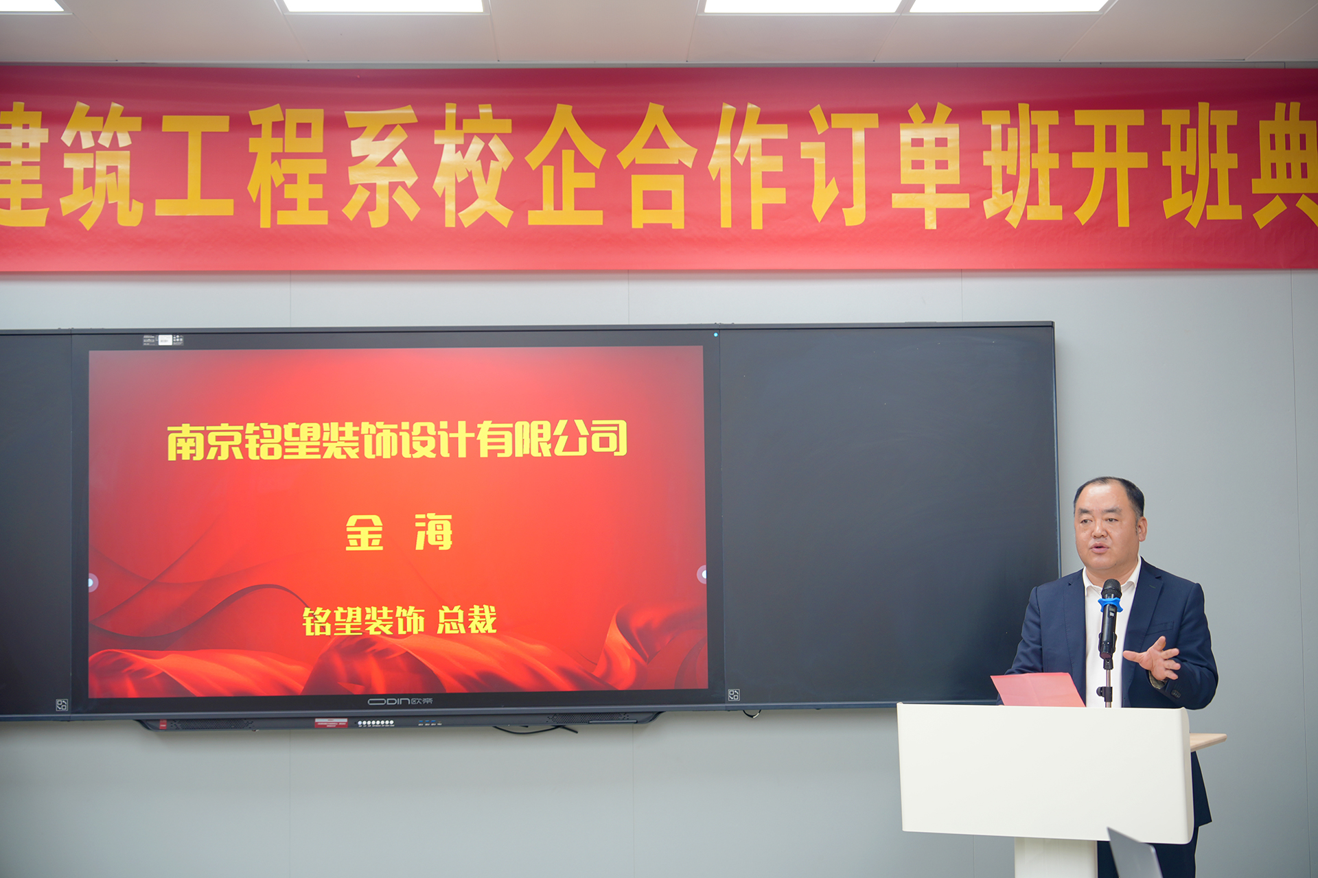 南京铭望装饰有限公司总裁金海在致辞中表示,公司将全力支持订单班的人才培养工作,为学员提供优质的实践平台和学习资源,助力他们成长为行业内的佼佼者。江苏智檬智能科技有限公司董事长温砚也发表了热情洋溢的致辞,他强调,校企合作是实现教育链、人才链与产业链、创新链有机衔接的重要途径,期待双方能在未来的合作中取得更加丰硕的成果,共同推动职业教育和产业的创新发展。