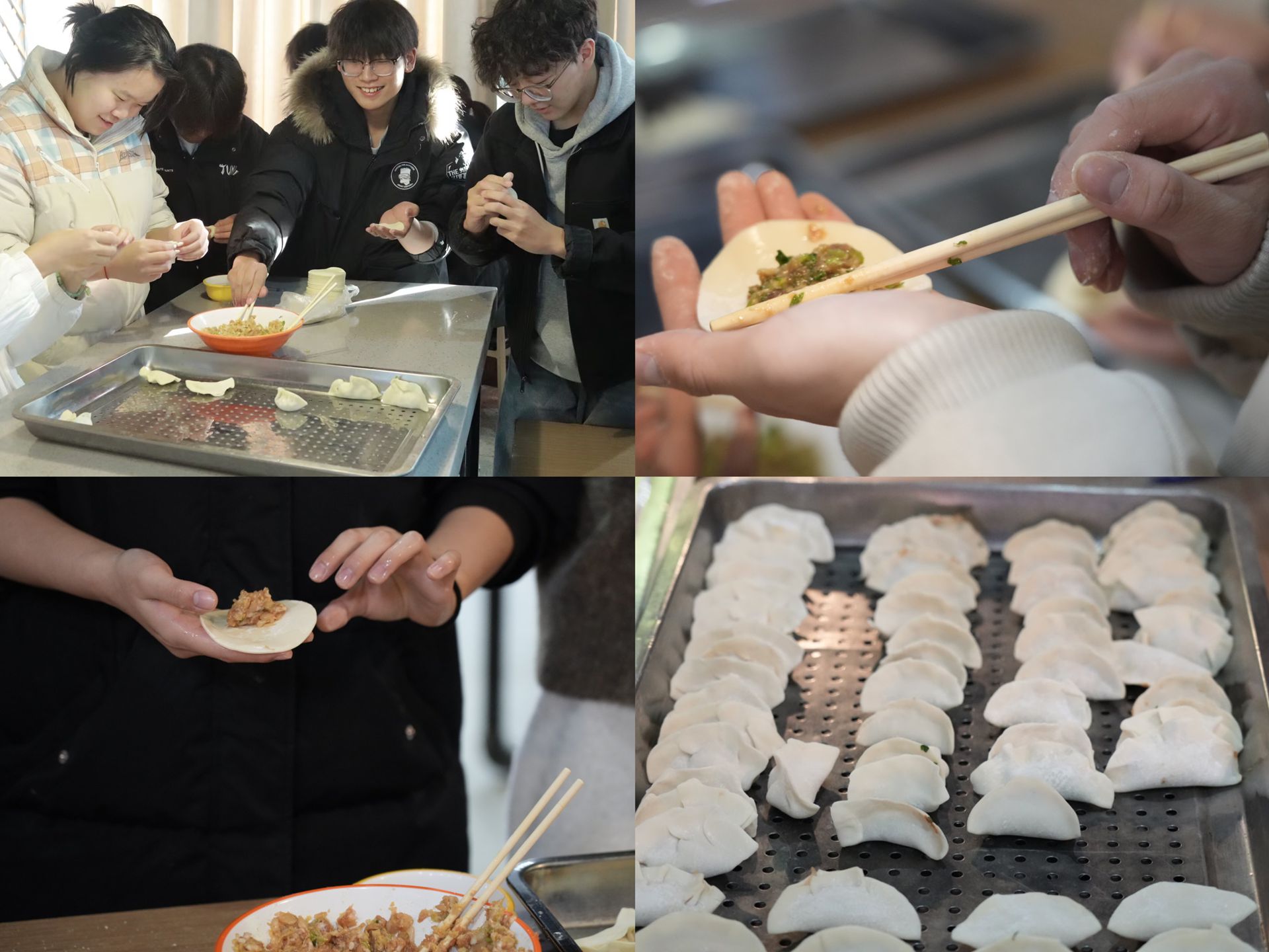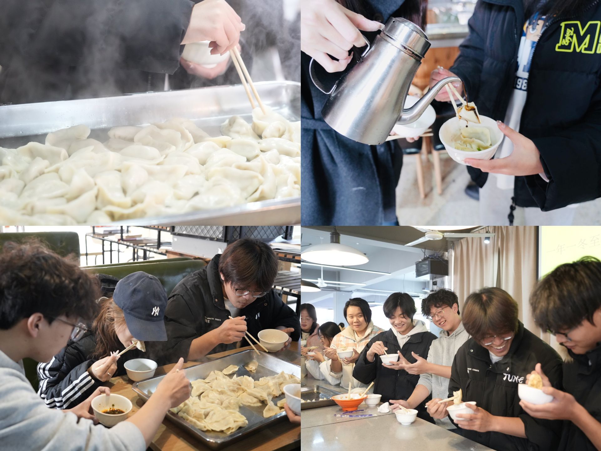 不一会儿,热腾腾的饺子就出锅了。同学们围坐在桌边,瞬间将温暖传遍全身,大家纷纷赞叹饺子的美味。整个活动过程当中大家其乐融融,在劳动中分享经验,在协作中交流情感,在行动中舒缓压力。同学们吃着热腾腾的饺子,欢声笑语不断,驱散了冬天的寒意。小小的饺子,包起的不只是一份美味,更是满满的温暖与幸福。