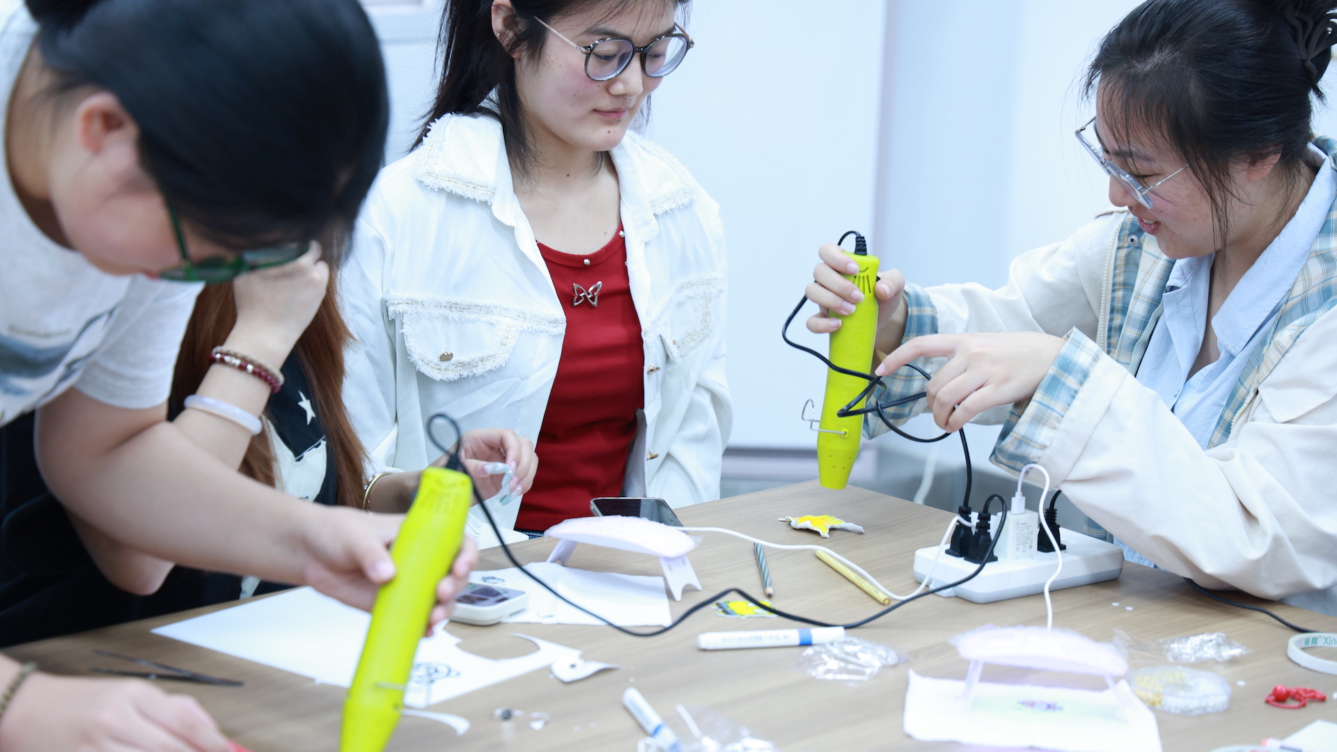 活动现场洋溢着轻松愉悦的创造气息,在徐老师的指导下,一片片原本普通的透明胶片,在同学们专注的创作和神奇的热风作用下,逐渐“浓缩”为色彩鲜艳、造型各异的精美挂件或钥匙扣。