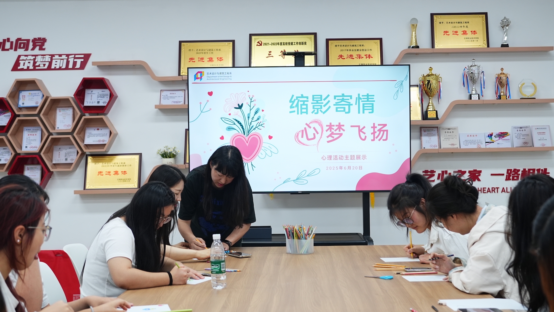 为深化心理健康教育工作,营造积极、阳光的校园文化氛围,6月20日,艺术设计与建筑工程系于8202教室成功举办了“缩影寄情,心梦飞扬”热缩片DIY主题心理活动。特邀专业教师徐嘉嘉老师教学,老师们积极参与其中,与学生们共同开启了一场指尖上的心灵之旅。