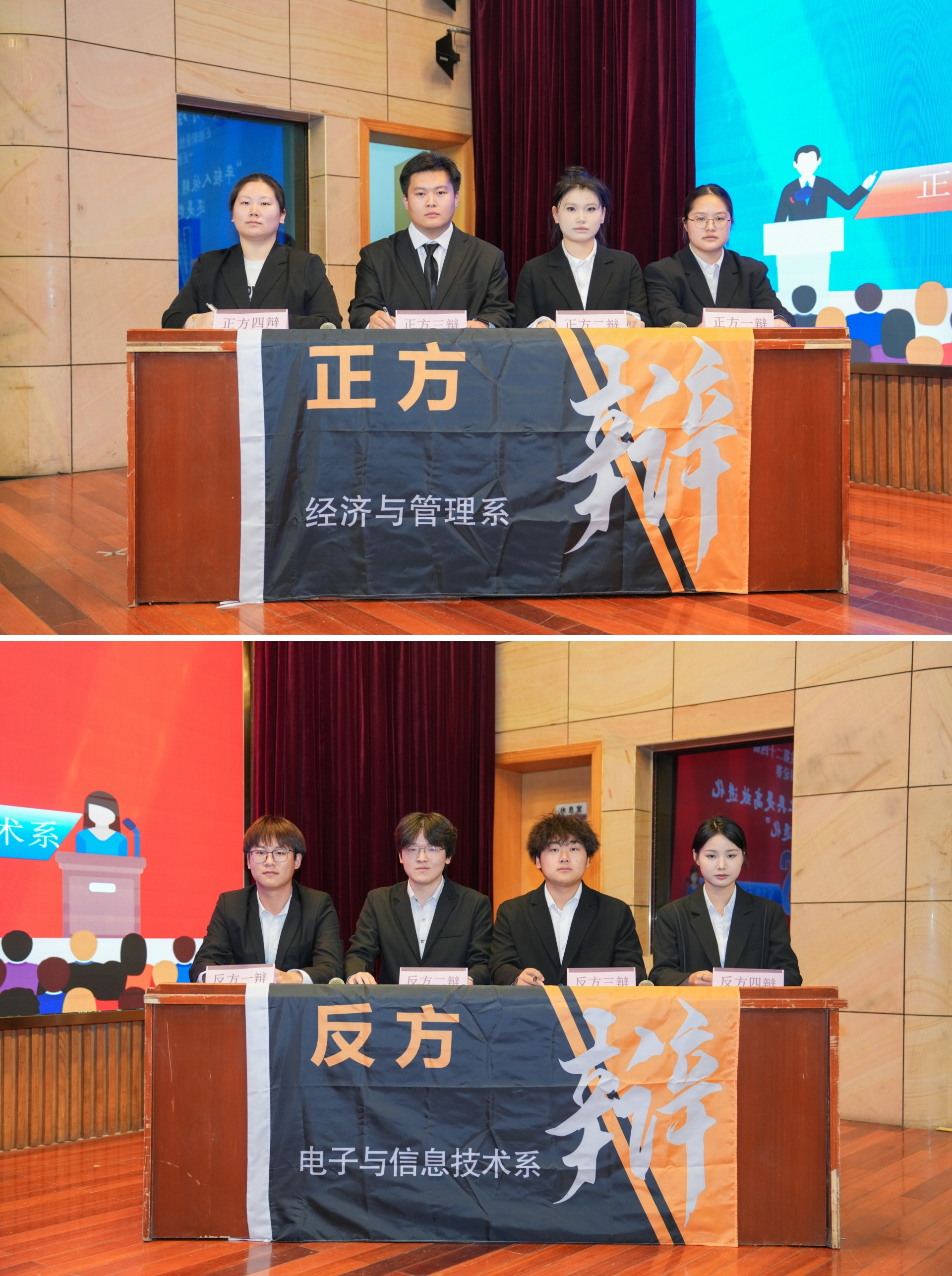 本届辩论赛分初赛、复赛、决赛,实行淘汰赛制,共六支队伍参加。辩题紧扣当下热点话题,各系学生同场论辩、同台竞技,思想碰撞,火花四溢。经过前期在一站式社区进行的比赛,电子与信息技术系和经济与管理系两支队伍的优秀辩手们脱颖而出,在决赛的舞台上进行了一场激烈的交锋。双方辩手针对辩题:“年轻人依赖AI工具是高效进化还是能力退化”展开激烈辩论。双方辩手围绕论点、引经据典、妙语连珠、旁征博引,现场气氛热烈而紧张。双方辩手势均力敌,现场氛围热烈高涨。