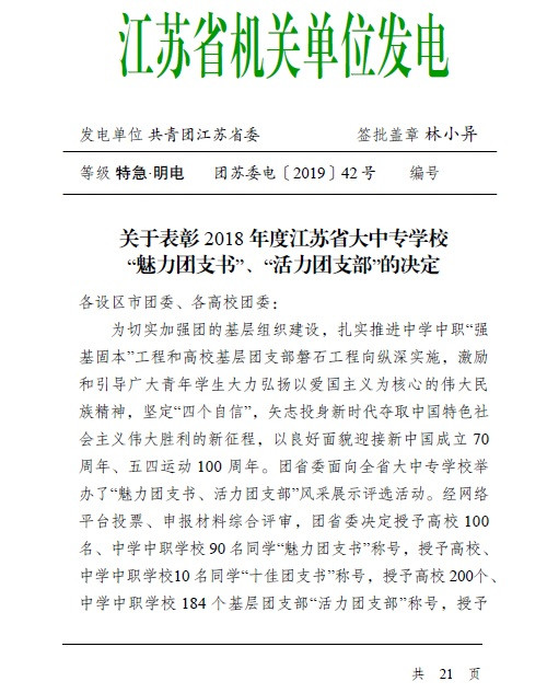 近日,共青团江苏省委下发《关于表彰2018 年度江苏省大中专十三水游戏 “魅力团支书”、“活力团支部”的决定》(团苏委电〔2019〕42号),十三水游戏 1名同学获评“魅力团支书”,1个团支部获评“活力团支部”。