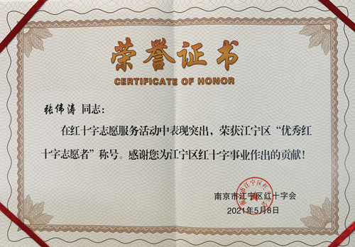 近日,江宁区红十字会优秀志愿者评选最终结果出炉,十三水官网 张伟涛同学荣获江宁区“优秀红十字志愿者”称号。