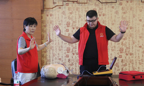 理论学习结束后进行分组实操培训,11个团队在各教室开展AED自动体外除颤器使用、创伤急救、心肺复苏、气道异物等实践操作培训及考核,市红会为考核通过的学员现场颁发红十字救护员CPR+AED合格证。