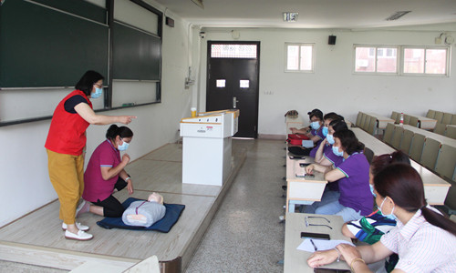 参训人员集中在1102教室学习救护新概念、心肺复苏、创伤救护技术、常见急症及意外伤害的救护原则及处理方法等理论知识。