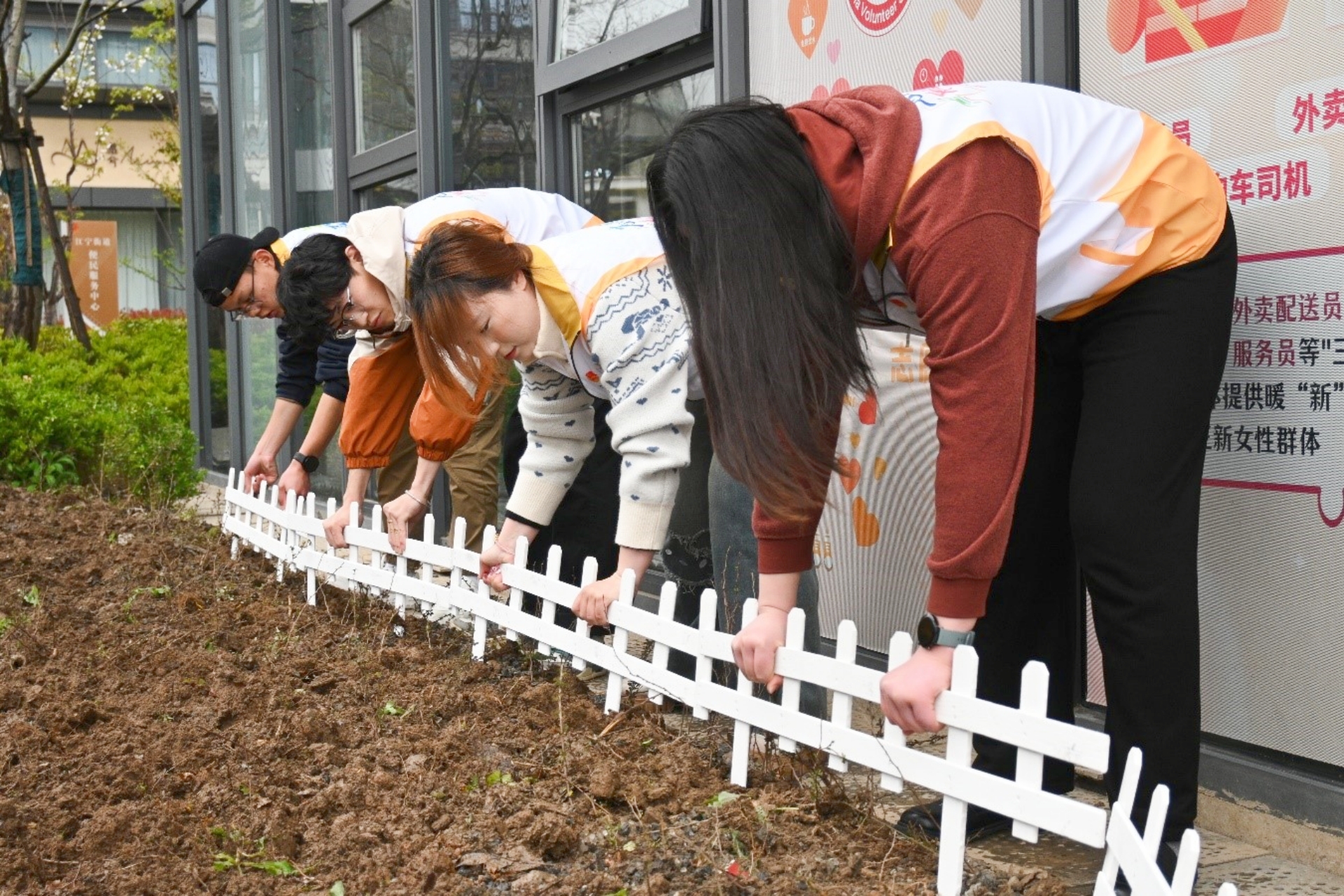 做一次志愿服务。宣讲过后,志愿者们满腔热情,投身到流动团员服务驿站门口花园的改造工作中。他们分工合作,默契配合,有的细心地在草地上播撒花籽和菜籽,期待着不久的将来,这片草地能够绽放出五彩斑斓的花朵和绿油油的蔬菜。有的则忙着加装美化栅栏,他们用心挑选材料,精心制作,力求让栅栏既美观又实用。还有的志愿者发挥创意,进行DIY轮胎装饰,他们将废旧轮胎变废为宝,经过一番巧手改造,变成了别具一格的花园装饰。经过大家的共同努力,花园焕然一新,变得更加美丽和温馨。志愿者们的脸上洋溢着满足和喜悦的笑容,他们用自己的实际行动为社区环境的美化贡献了一份力量。