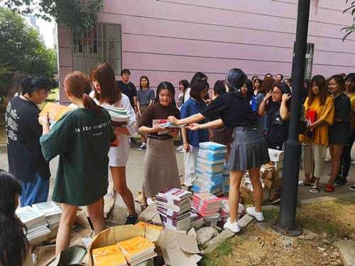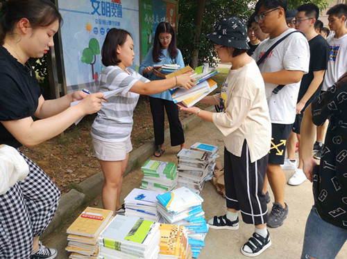开学前,在辅导员的带领下,同学们都领到了新书。发书现场井然有序。