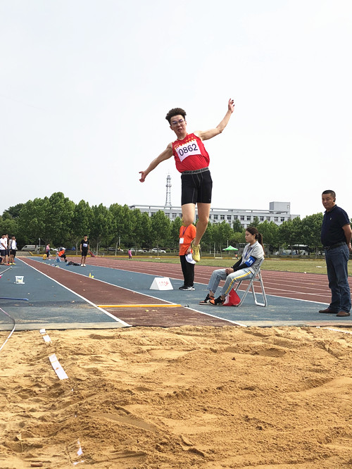 荣获男子跳远冠军的王佳同学在比赛中