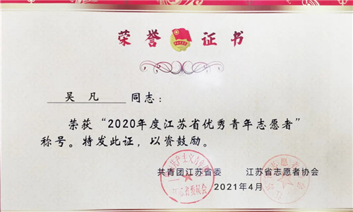 日前,共青团江苏省委和江苏省志愿者协会对2020年度江苏省青年志愿者行动评选进行了表彰,十三水游戏 学生吴凡荣获“江苏省优秀青年志愿者”称号。