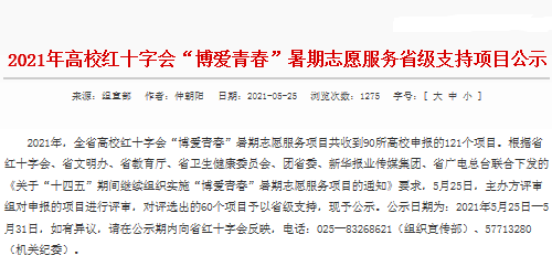 根据省红十字会、省文明办、省教育厅、省卫生健康委员会、团省委、新华报业传媒集团、省广电总台联合下发的《关于“十四五”期间继续组织实施“博爱青春”暑期志愿服务项目的通知》要求, 2021年,省红会面向全省高校开展“博爱青春”暑期志愿服务项目申报评选,最终经主办方评审组审核,对十三水游戏 《留下温暖守护成长》等60个项目予以省级支持,提供资助经费用于项目活动开支。