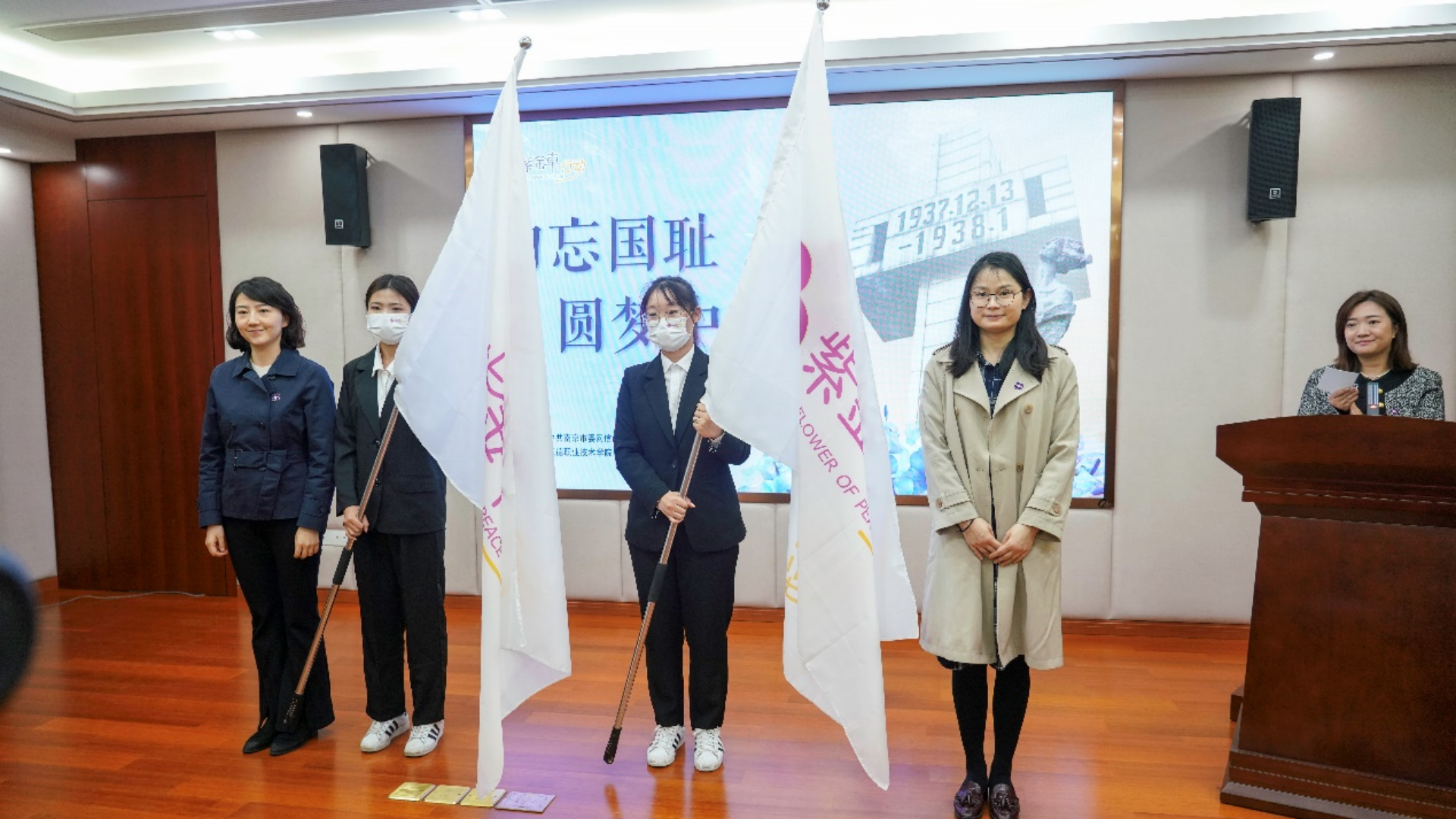 现场,中共南京市委网信办网络传播处副处长聂颖、共青团南京市委员会宣传部副部长王璀上台授旗,经济与管理系学生代表龚春卉同学、唐逸菲同学上台接旗。