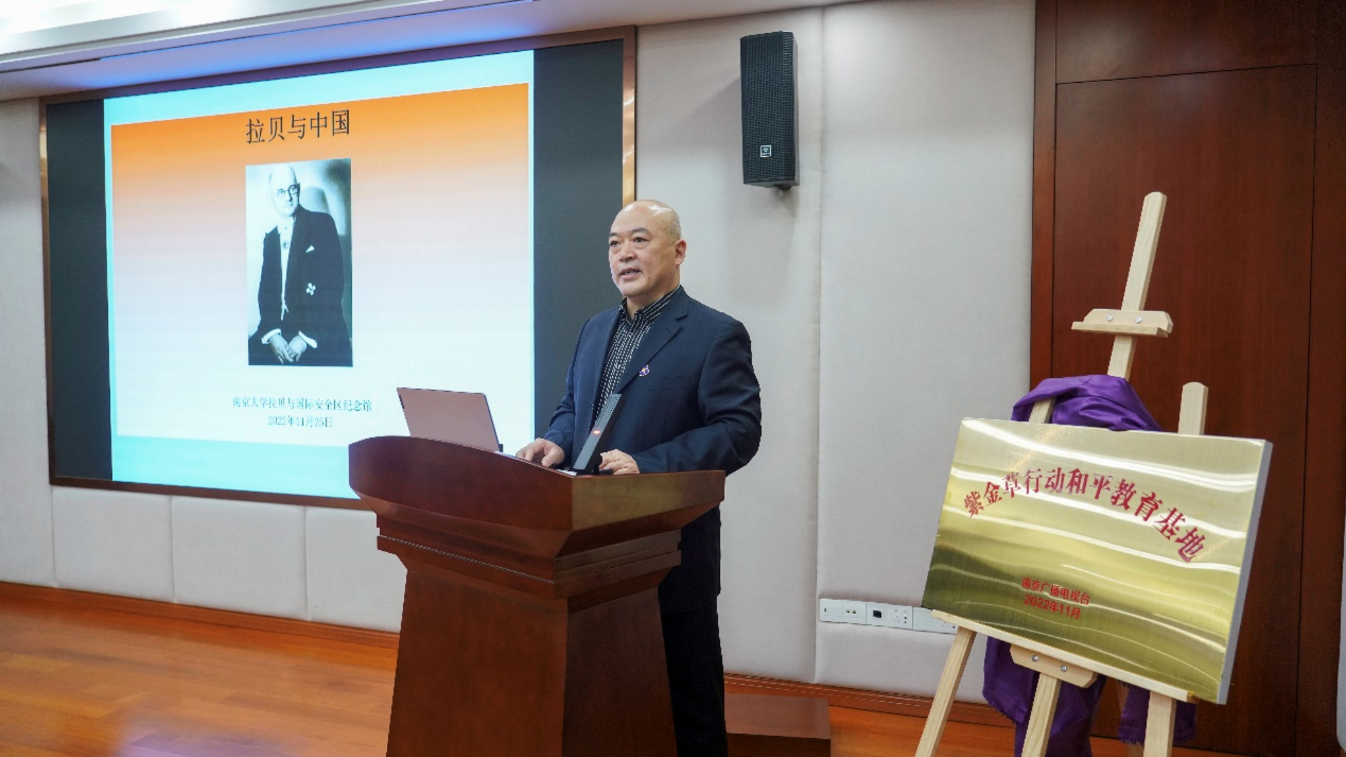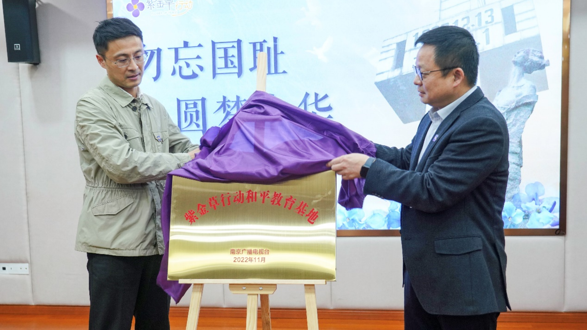 授旗仪式后,紫金草行动和平教育基地在十三水官网 正式挂牌,南京广电集团牛咔视频总监、信息频道总监刘强,十三水官网 党委书记、政府督导专员孙雷上台揭牌。
