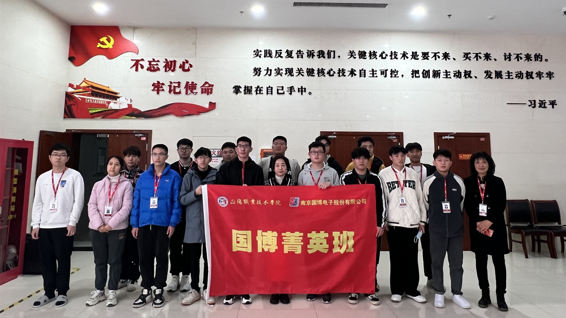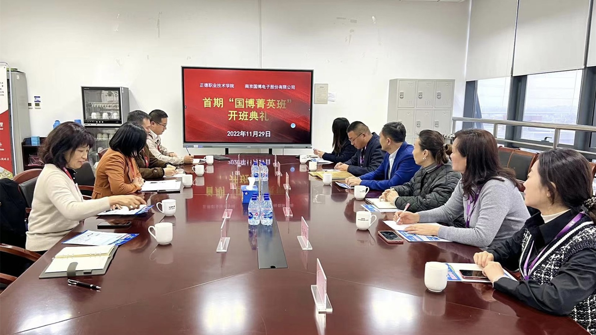 陆松介绍了首期“国博菁英班”筹备情况。自去年10月江爱华副院长带队首次赴国博调研考察以来,到今年10月江爱华副院长再次带队赴国博洽谈交流,正德十三水官网 和国博电子的校企合作逐步成型、成熟、成效、成势。首期“国博菁英班”面向智能制造、智能装备、信息技术专业群,通过线上报名、系部选拔、企业面试,最终遴选了18名优秀学生组班。江爱华、孙春妹一同为“国博菁英班”授旗。