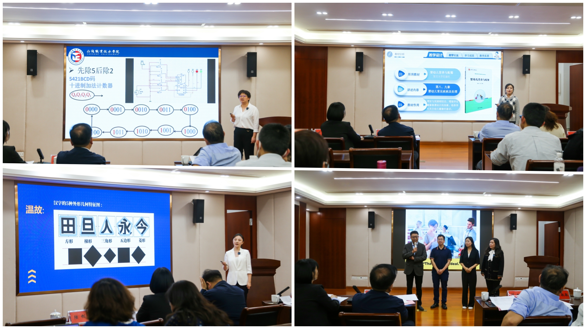比赛对标全国教师教学能力大赛要求,参赛教师经过“选择教学主题、组建教学团队、组织教学设计、提炼教学特色、系部支持指导、打磨教学展示”,最终共有8个教学团队、26名教师从教学实施报告、无生教学展示、现场答辩三个环节全面地展示了教学团队课堂教学的基本功。现场共评选出一等奖作品1项、二等奖作品2项、三等奖作品3项、优胜奖作品2项。