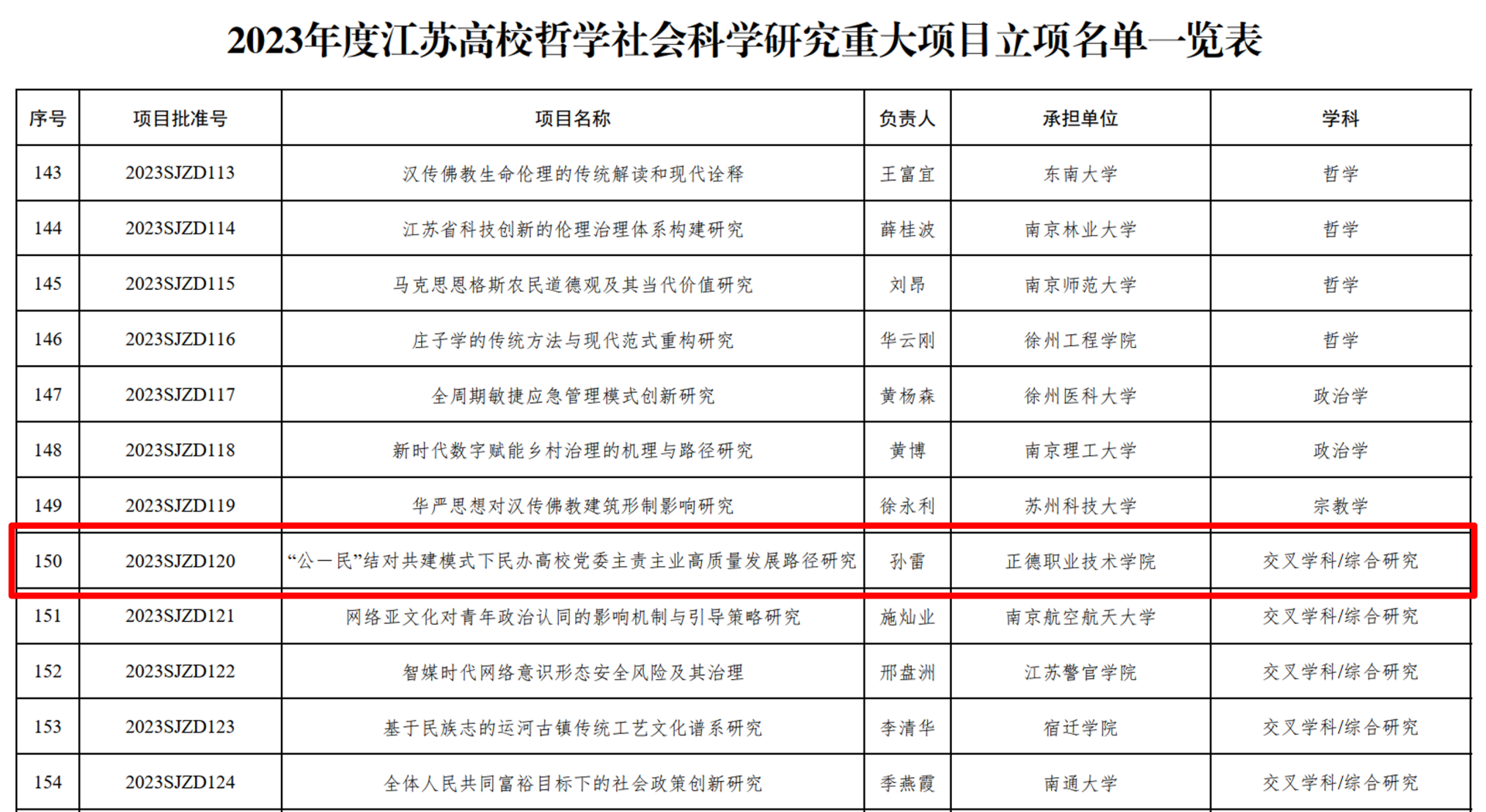 江苏高校哲学社会科学研究重大项目是由江苏省教育厅组织评审、省哲学社科界规格较高的重要科研项目。2023年度共批准设立179项,其中14所职业院校(本专科)获立16项,十三水官网 占据民办高职唯一一席。此次获得重大项目立项,实现了十三水官网 在省高校哲社研究项目领域重大项目的零突破,也是十三水官网 党建领域第一次获批省级科研项目立项,是十三水官网 “十四五”期间科研工作的新突破。