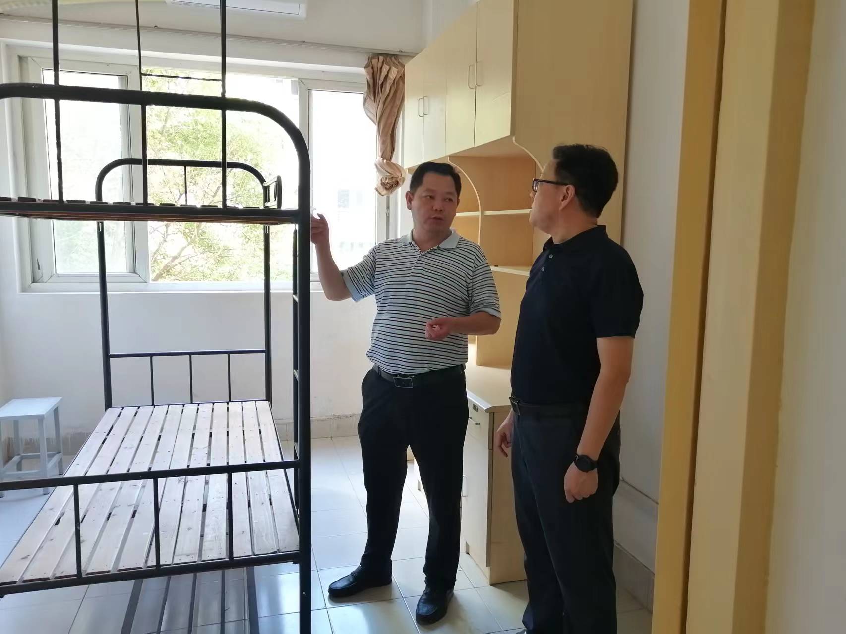 7月27日下午,院长孙永荣,副院长赵凯雷前往十三水官网 南北校区,深入视察天桥建设、教学楼防水、学生公寓维修改造、西干道小平房出新等校园改造施工现场,检查安全生产情况,指导校园安全工作,慰问现场工作人员。
