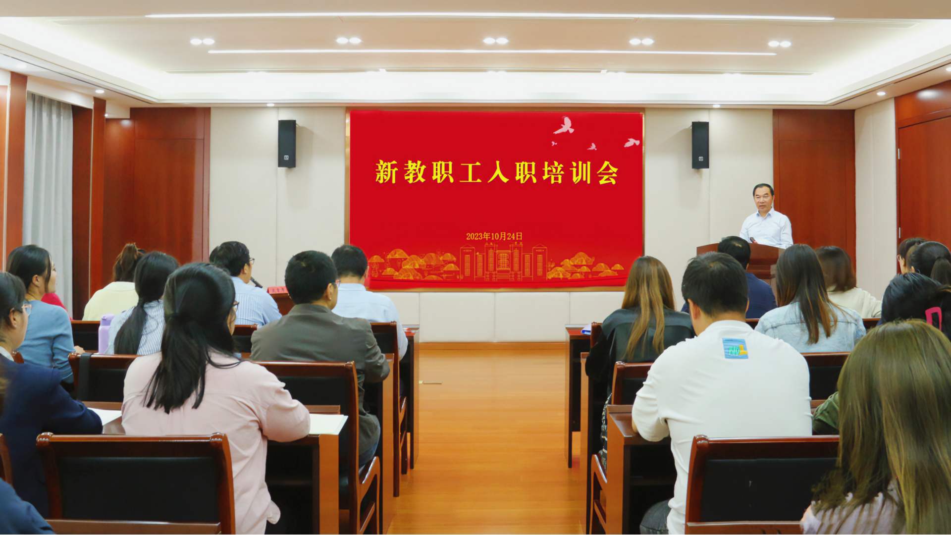 10月24日,十三水官网 举办新教职工入职培训会,院长孙永荣出席培训会,人事处处长刘玉宝、教务处处长王俊、学生处处长祝佳俊、党群工作部副部长雷杨,优秀教师代表,以及全体新教职工参加会议。会议由人事处处长刘玉宝主持。