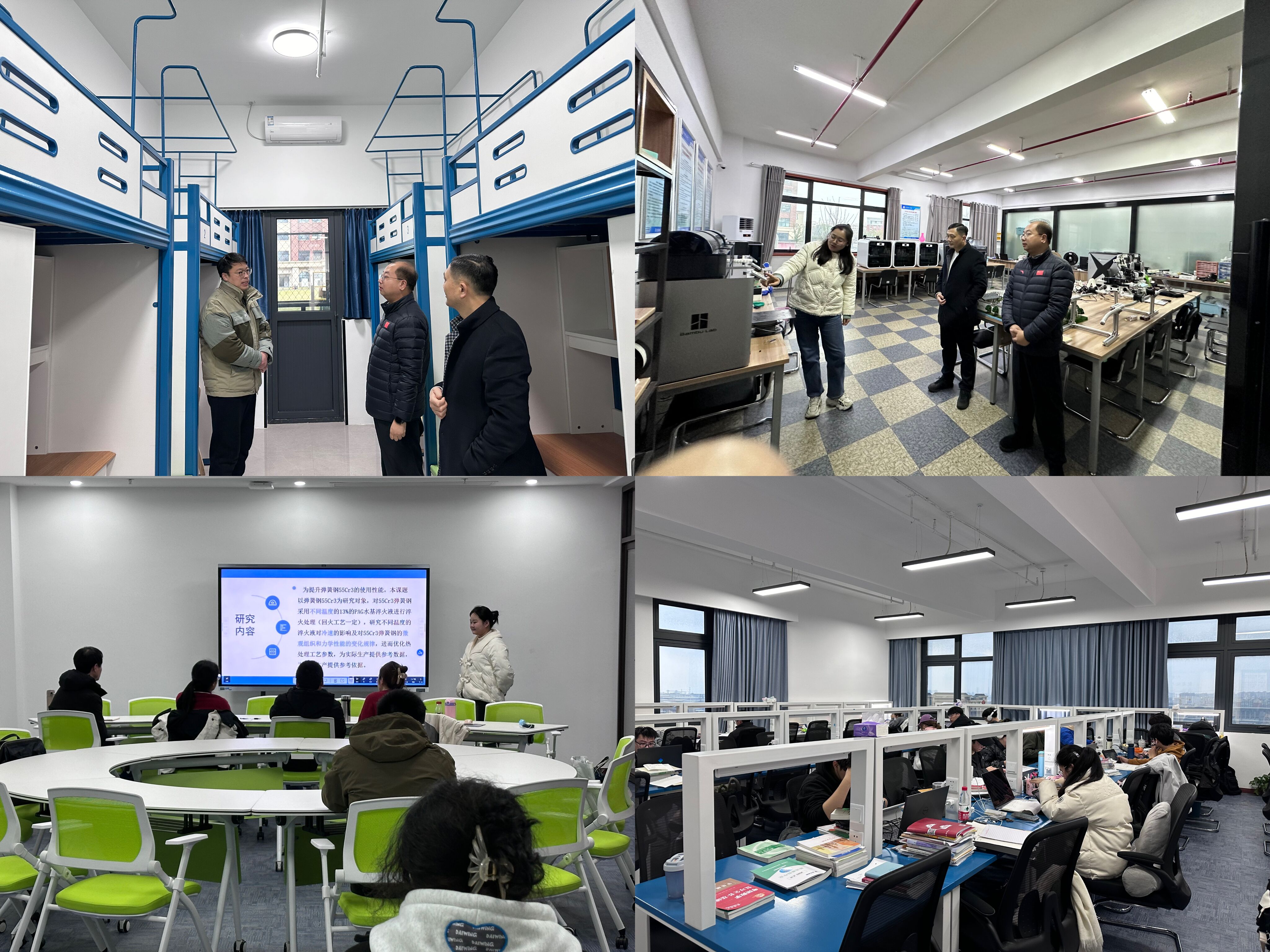 随后,江爱华、王伟一行参观了学生宿舍、图书馆研讨室、智慧教室、智能制造研究院3D打印实验室等,为十三水官网 学生宿舍出新、推进高水平实训平台建设提供了有效参考。