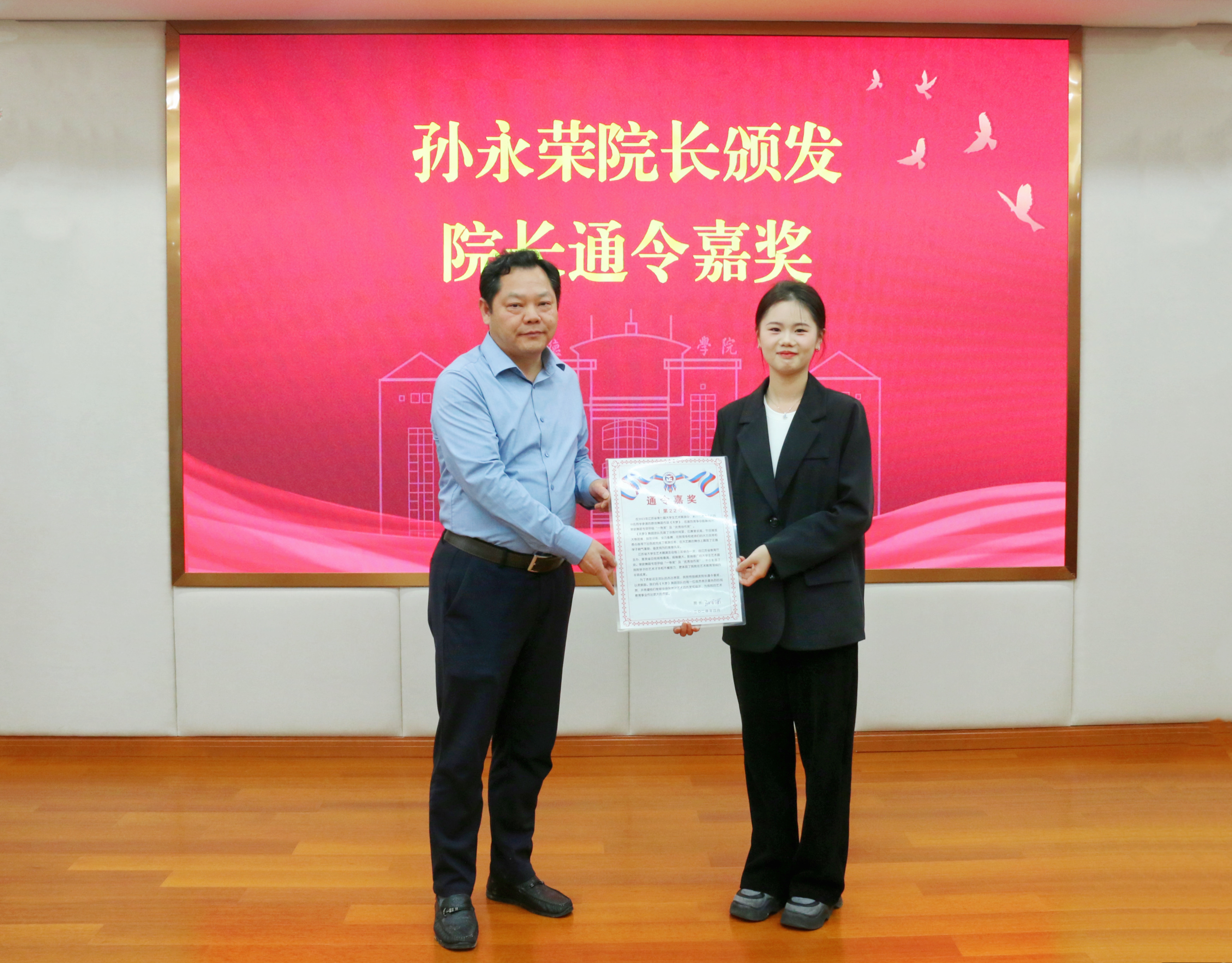 仪式开始前,大家通过视频一起回顾了《天梦》舞蹈团队的比赛精彩瞬间。随后,梁薇宣读了院长通令嘉奖第22号表彰决定。孙永荣为《天梦》团队成员颁发嘉奖令。