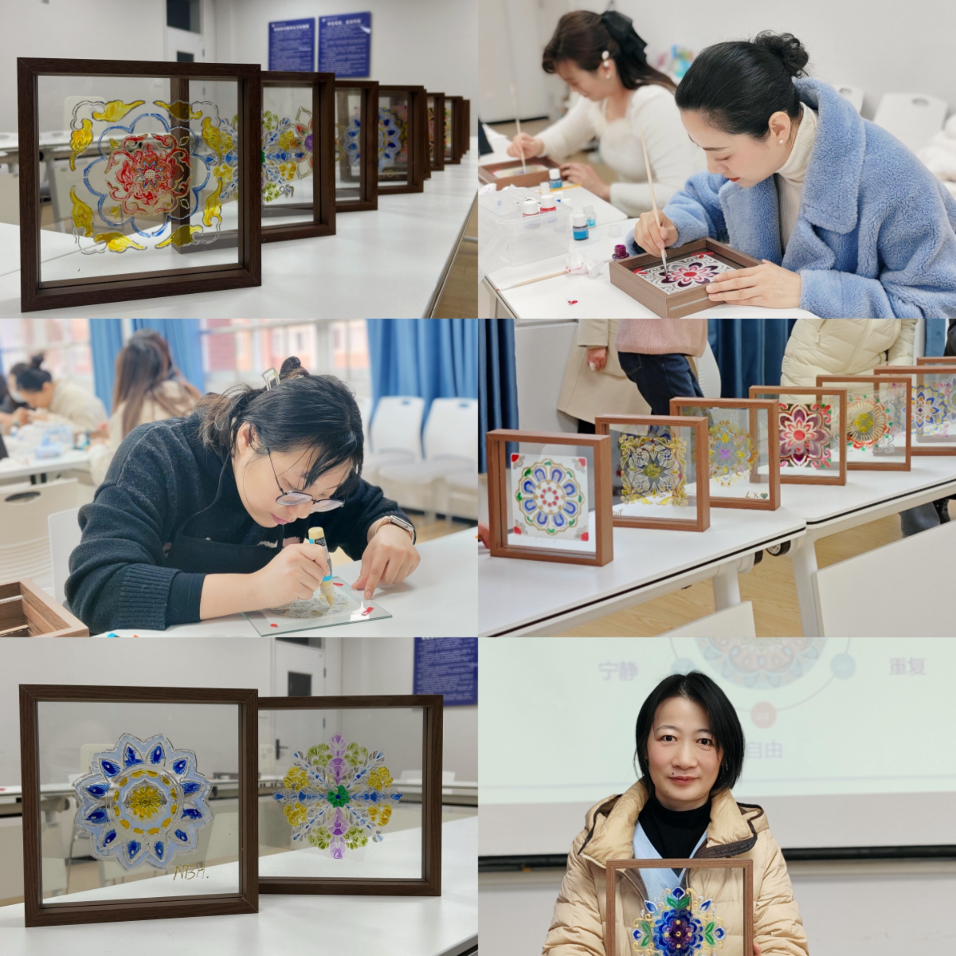 活动伊始,樊荣简要介绍了曼陀罗绘画的起源与心理疗愈功能,强调其对称、重复的图案结构能帮助我们集中注意力、平复情绪,激发潜意识中的创造力和自愈力。随后,在相关老师的指导下,大家纷纷拿起画笔,全神贯注地投入到曼陀罗玻璃画的创作之中,色彩斑斓的颜料在玻璃上交织、碰撞,仿佛置身于一个五彩斑斓的艺术世界。