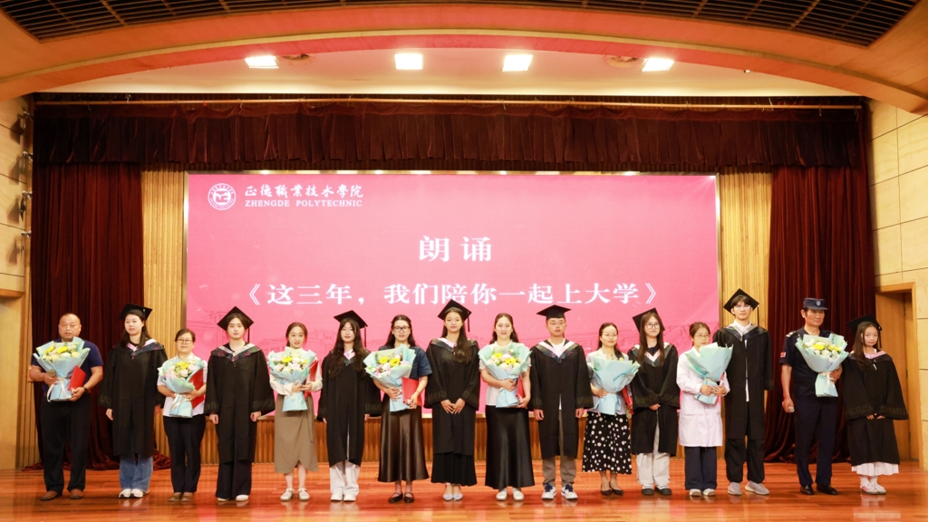 由辅导员、教师、行政人员、校医务室工作人员、宿管阿姨、保安师傅、食堂大叔共同带来的朗诵《这三年,我们陪你一起上大学》,将校园时光的片段娓娓道来,用陪伴表达最长情的告白,一声声“常回家看看,亲爱的同学们”是最贴心的关怀。