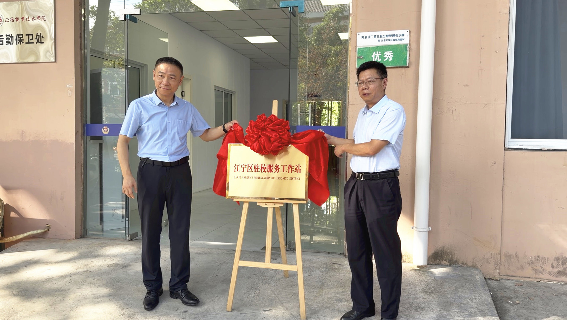 仪式在庄重热烈的氛围中开始。夏玉龙与高斌共同为“江宁区驻校服务工作站”揭牌。红绸揭下的瞬间,标志着校地协同、资源整合的校园法治建设与平安建设工作开启了新篇章。