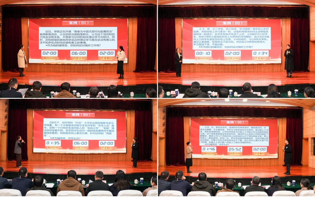 决赛围绕辅导员核心职责,全面考察参赛选手的理论基础与政策把握能力,通过案例研讨考察辅导员综合运用理论分析问题、研判问题、解决问题的能力。选手在赛前抽取小组、AB角签位,通过“我提问,你回答”的方式交互开展,围绕学生工作中的典型场景展开深度剖析,结合实际工作经验和特色方法,共同辨析案例原因、核心问题、思路目标、对策举措、总结规律,展现解决实际问题的能力和智慧。赛后陶琨进行点评,充分肯定了参赛选手们的综合表现,认为选手们逻辑清晰、措施务实,凸显了育人工作的温度,体现了良好的分析研判能力。