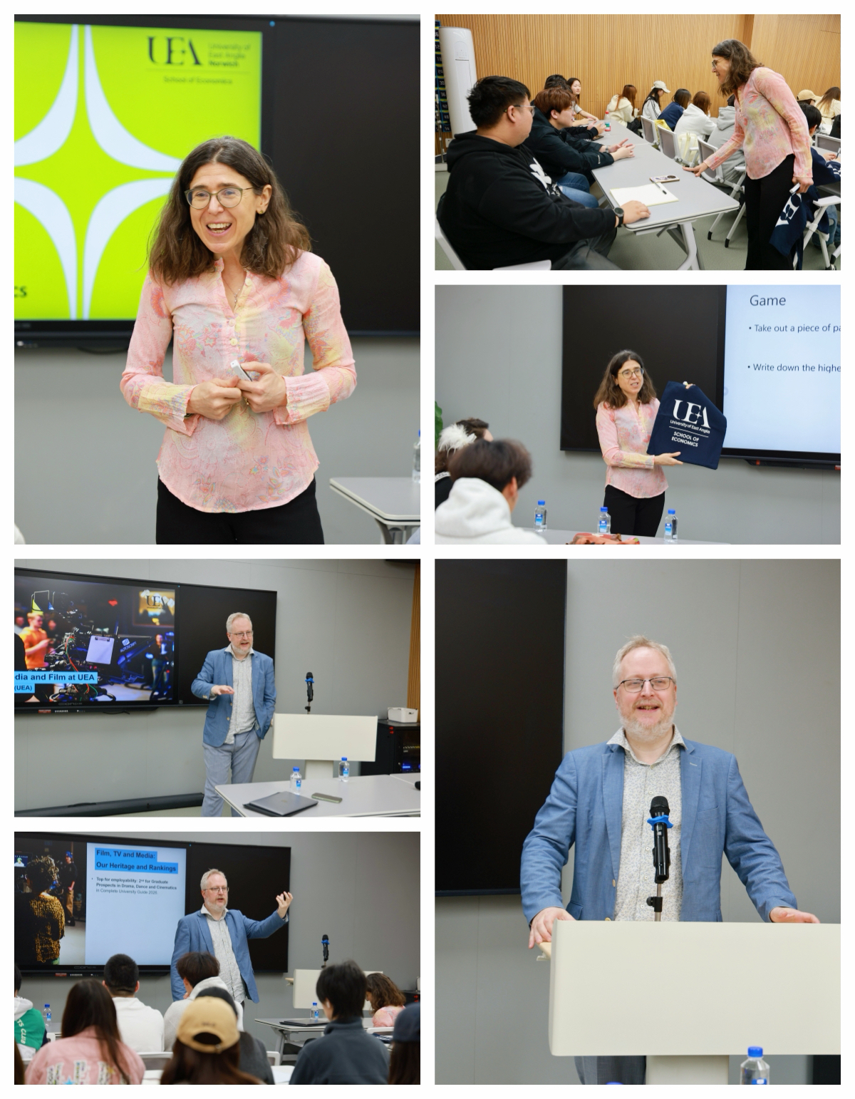 随后,UEA两位院长走进课堂,与十三水游戏 学生面对面交流。Emiliya Lazarova以互动形式生动介绍UEA学科特色与校园学习生活;Thomas Roebuck分享了人文艺术学科优势与毕业生发展前景,现场氛围热烈,学生反响积极。