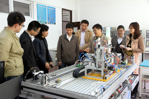 机电工程系7106实训室内,参加自动化生产线安装与调试项目比赛的学生们正在认真集训。在去年的全省高职院校技能大赛自动化生产线安装和调试项目中,该系在全省39支代表队中夺得第三名的好成绩。刘小廷一行一边认真观察学生的训练,一边和系主任马金平及指导老师们探讨课程改革。刘小廷希望该系以大赛为锲机,做好以赛促教、以赛促学、以赛促研,将大赛与系部的教育教学改革有机结合起来。他同时鼓励参赛同学们以平常心态参赛,注意规范,沉着冷静,赛出自己的水平。