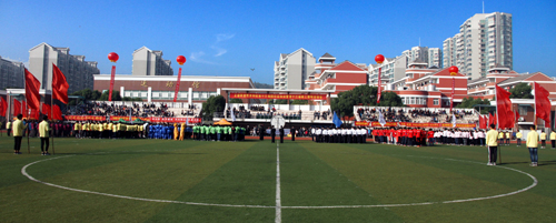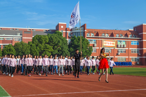 踏着激昂的运动员进行曲,在校旗校徽的引导下,各系代表队迈着矫健的步伐、喊着响亮的口号,精神抖擞、斗志昂扬地向主席台走来。