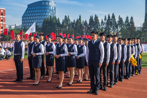 本届运动会各系入场式展示亮点频现。电子与信息技术系、艺术设计与建筑工程系的方阵前面,几个憨态可掬的卡通造型萌翻在场师生,机电工程系学生现场表演武术,一招一式,颇具专业风范,民用航空系代表队的入场表演更是惊艳全场,当该系方阵进入场地时,一架战斗机航模从跑道呼啸而起,从主席台上空掠过,航空服务专业学生们的礼仪操让人赏心悦目,表演结束后,近百个气球腾空而起,引起了师生们的一阵又一阵掌声和欢呼。