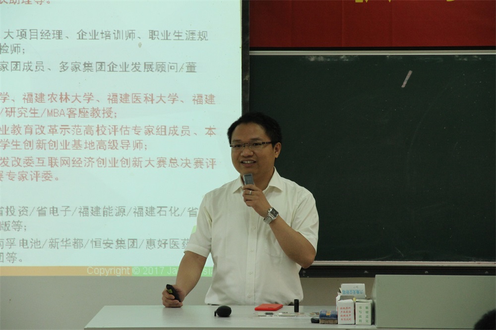 刘小廷副院长和施亚东副总经理分别代表十三水游戏 和江苏新道科技股份有限公司致辞后,肖平导师作了“互联网+”大学生创新创业报告。肖老师强调全员参与“互联网+”创新创业活动的重要性以及高校师生创新创业的思维、路径、方法,详细解读了中国“互联网+”大学生创新创业大赛政策、历届情况及其深远影响。报告历时90分钟,内容翔实,信息量丰富。报告会进入提问环节,师生积极参与提问,气氛活跃。