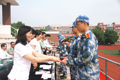 军训汇报表演后,赵凯雷副院长宣读了《关于表彰2017级新生军训标兵、优秀学员的决定》,主席台上的领导分别为军训优秀学员代表、军训标兵代表以及军训优秀教官颁发荣誉证书。