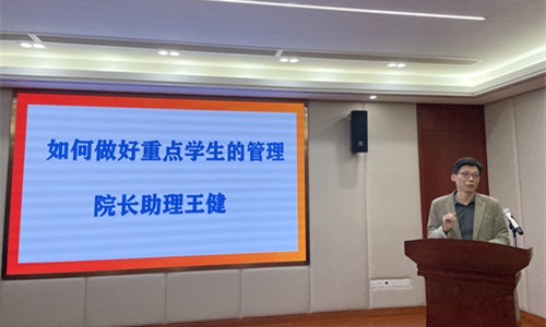 会上,王健结合近期重点学生工作调研走访情况,针对“如何做好重点学生的教育管理工作”提出建议,希望辅导员们充分合理运用规章制度,刚柔并济的发挥制度育人实效,并不断加强家校联动,形成育人合力。